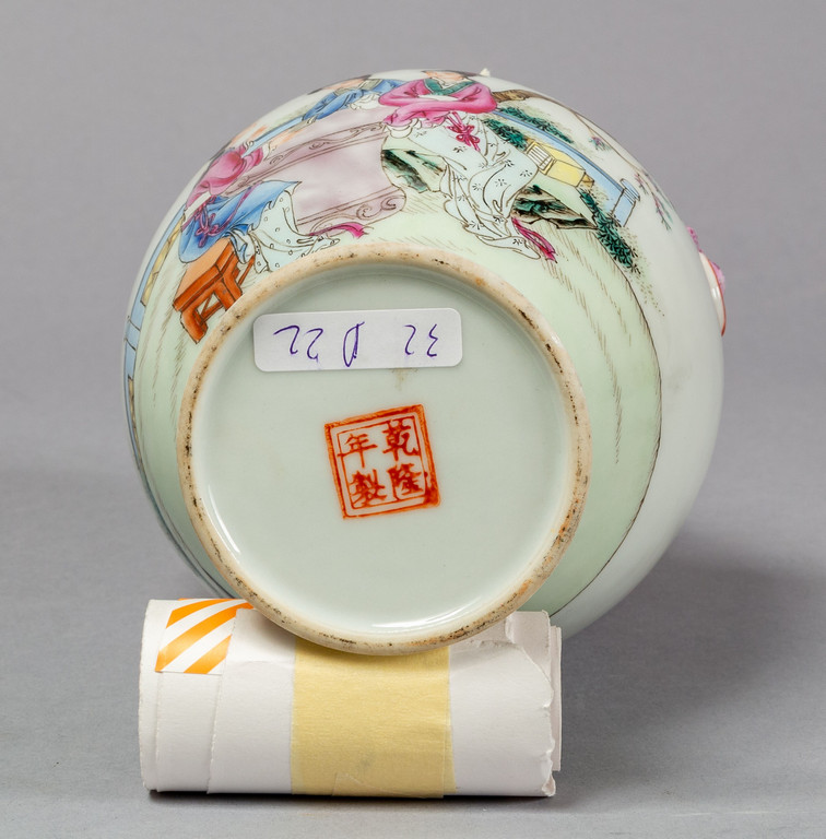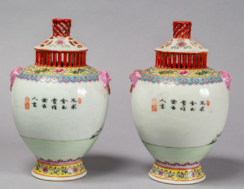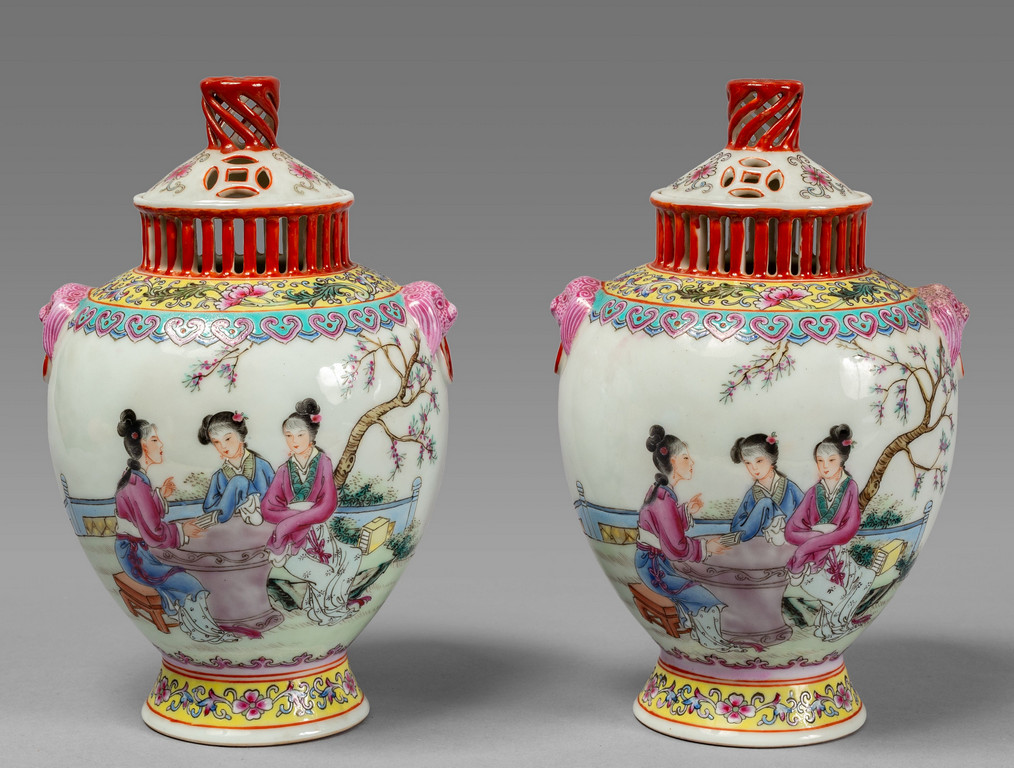 Due vasi in porcellana di Cina con coperchi raffiguranti fanciulle in giardino sec.XX