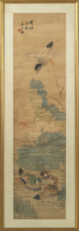 Pannello dipinto su seta raffigurante famiglia di papere nello stagno Cina inizi sec.XX