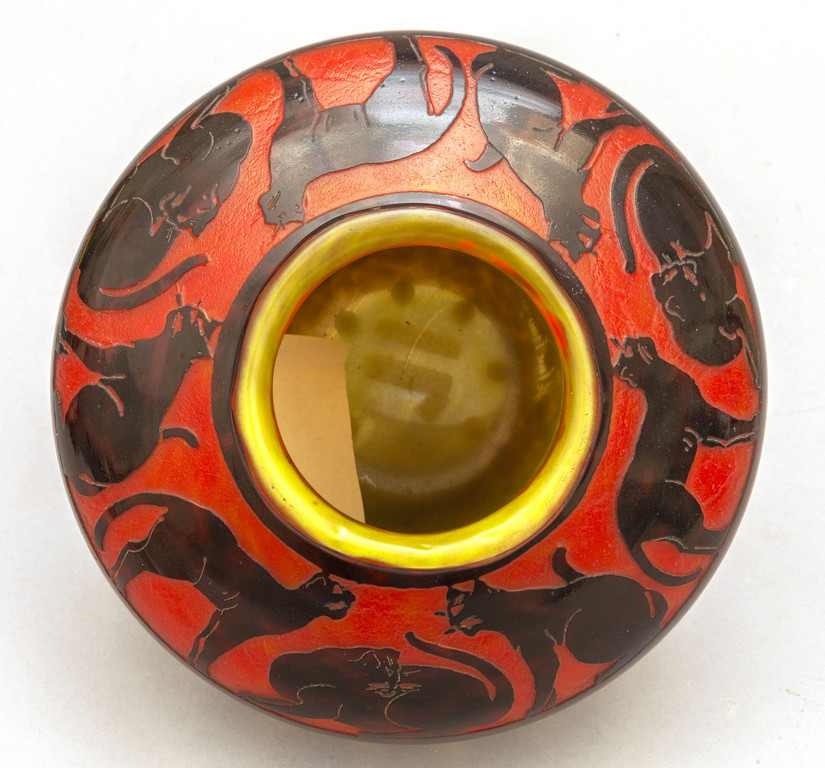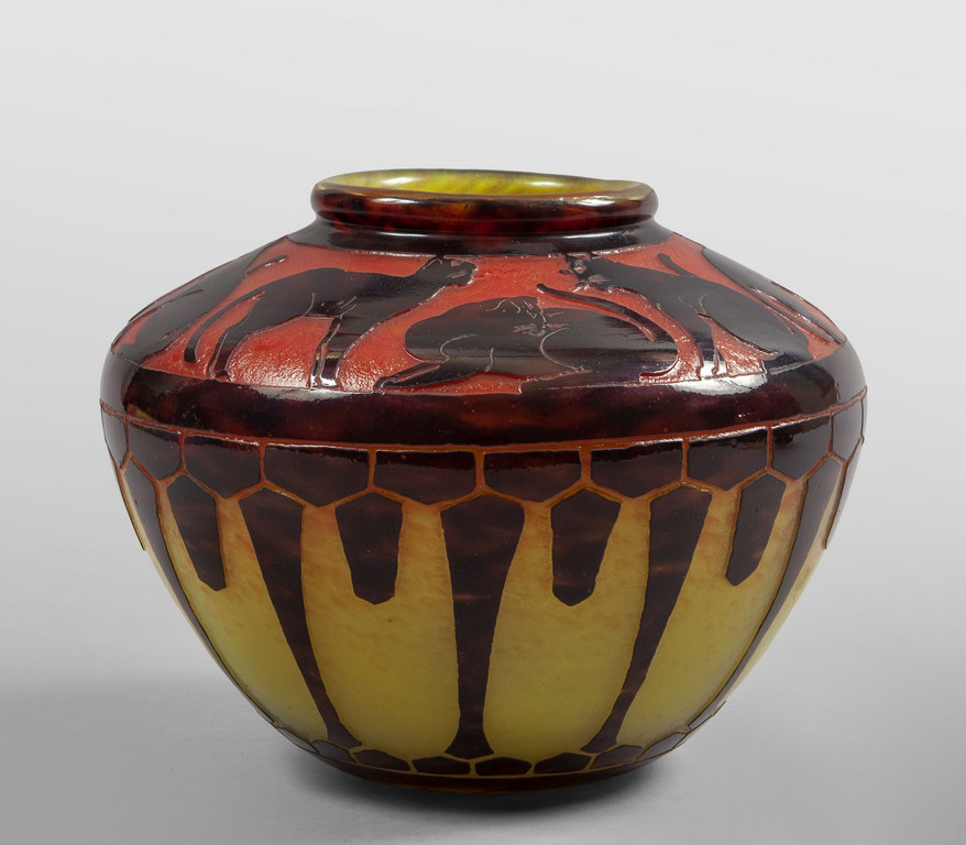 Le Verre Francais vaso in vetro cammeo decorato con ghepardi nei toni del rosso e del giallo metà sec.XX