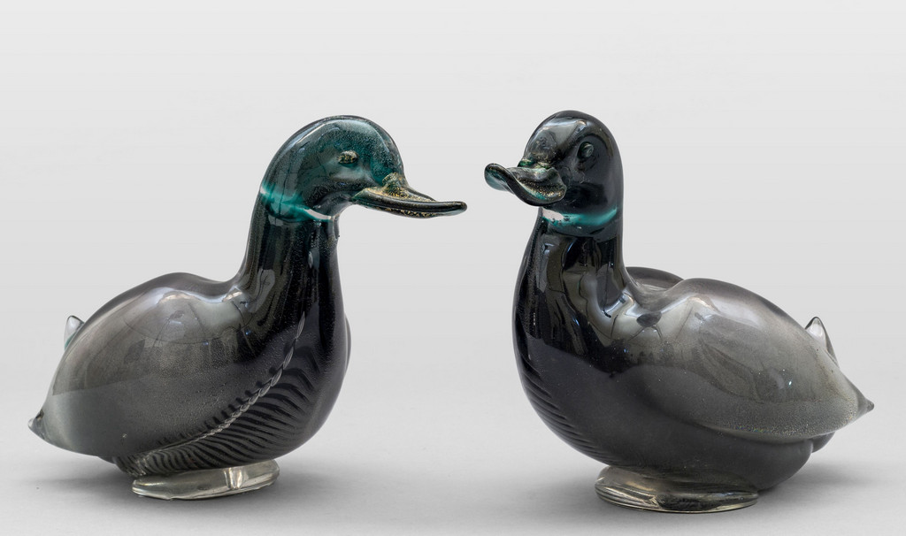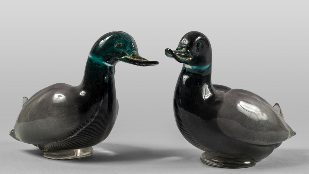Coppia di papere in vetro con lumeggiature in oro lievi difetti alla base