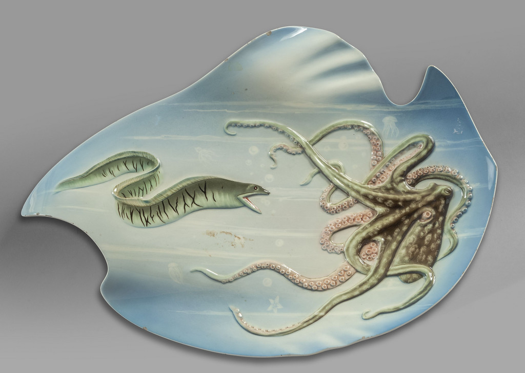 Lotta tra polpo e murena centrotavola in maiolica manifattura Vi Vi Torino
