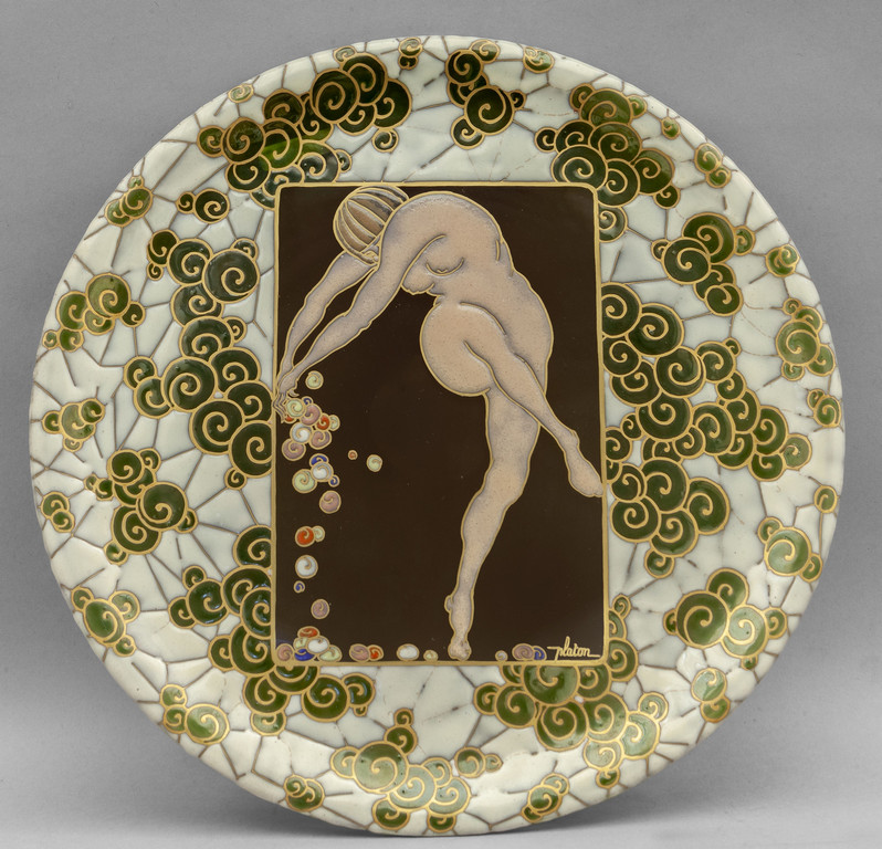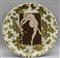 Piatto in vetro decorato al centro con figura femminile f.to Platon