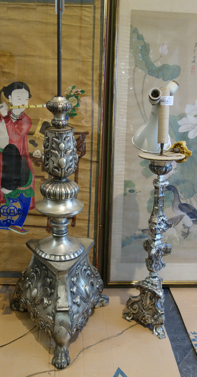 Candeliere Luigi XIV in metallo argentato (h.cm.73) e grande base per piantana in metallo argentato (h.cm.71)