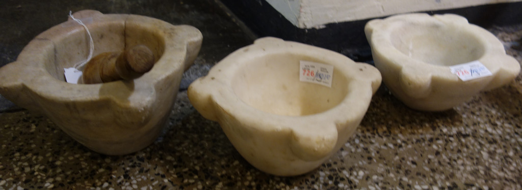 Tre mortai in marmo di diverse forme e misure di cui uno con pestello Genova sec.XIX