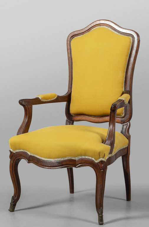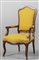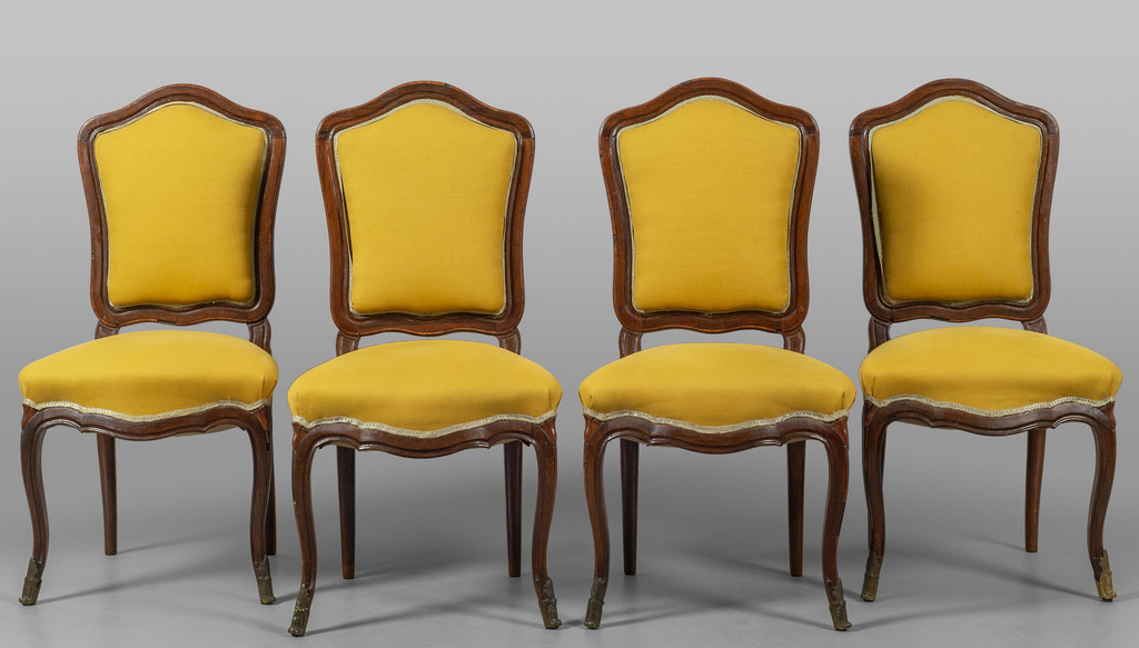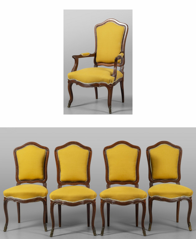 Quattro sedie ed una poltrona in stile Luigi XV foderate in stoffa gialla sec.XIX