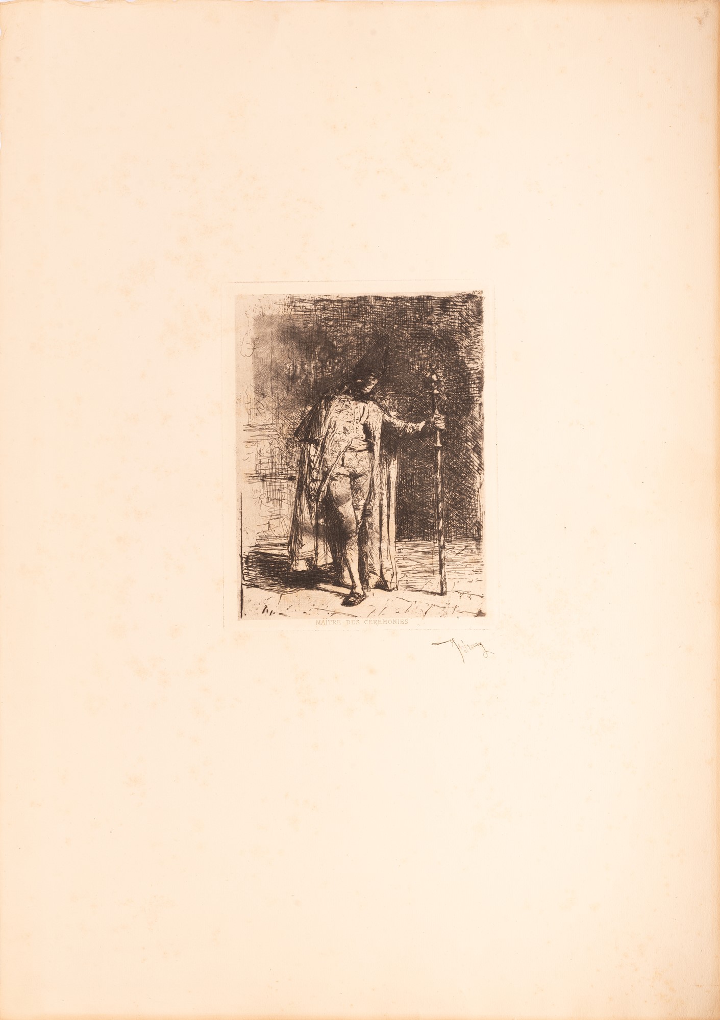 In questa stampa, la numero 28 del catalogo, come indicato dal numero inciso in alto a destra, viene rappresentato un uomo all'interno di una sala per lo più in ombra. Lo sfondo è scandito da due zone una più chiara a sinistra e in primo piano e una più grande scura a destra che si confonde con il volto dell'uomo. La forte inchiostrazione morbida e modulata e i giochi chiaroscurali ricordano la radice rembrantiana di Fortuny, il segno è libero e mosso; la lastra è uno tipico esempio della ricerca artistica del maestro. L'uomo è rappresentato in piedi frontalmente in abiti di foggia settecentesca, leggermente rivolto a destra ha il capo piegato a sinistra. La postura è solenne, indossa un lungo mantello realizzato con un tratto veloce e incisivo, porta un alto copricapo scuro, sembra indossare una maschera e con la mano sinistra si regge ad un bastone riccamente decorato alla sommità.