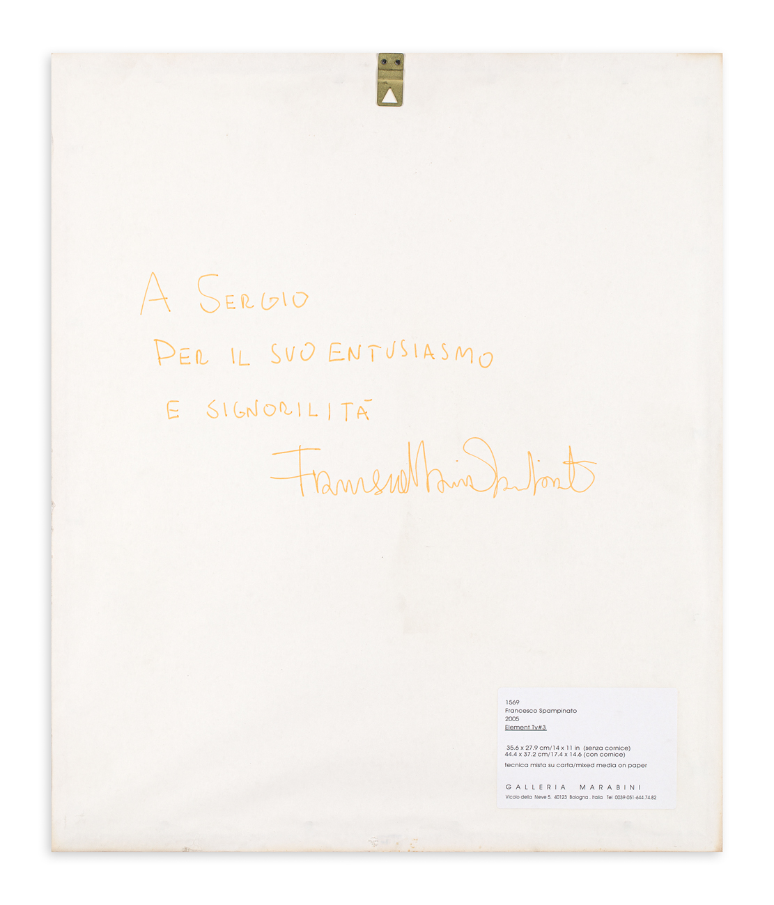 Etichetta della Galleria Marabini (BO) al retro del cartone protettivo