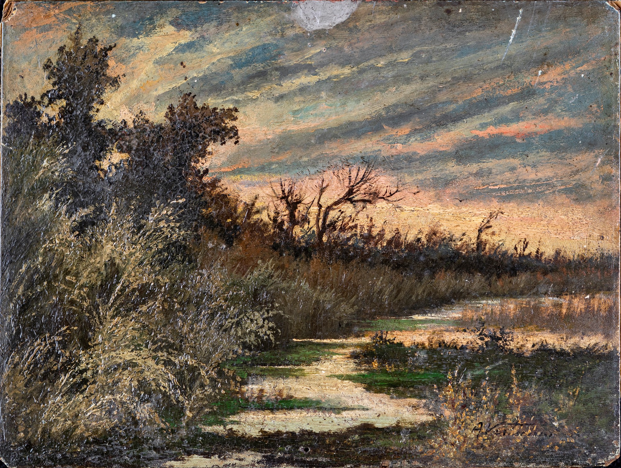 Achille Vertunni (Napoli, 1826 - Roma, 1897) Paesaggio palustre Olio su tavola - in cornice cm 35,5x45