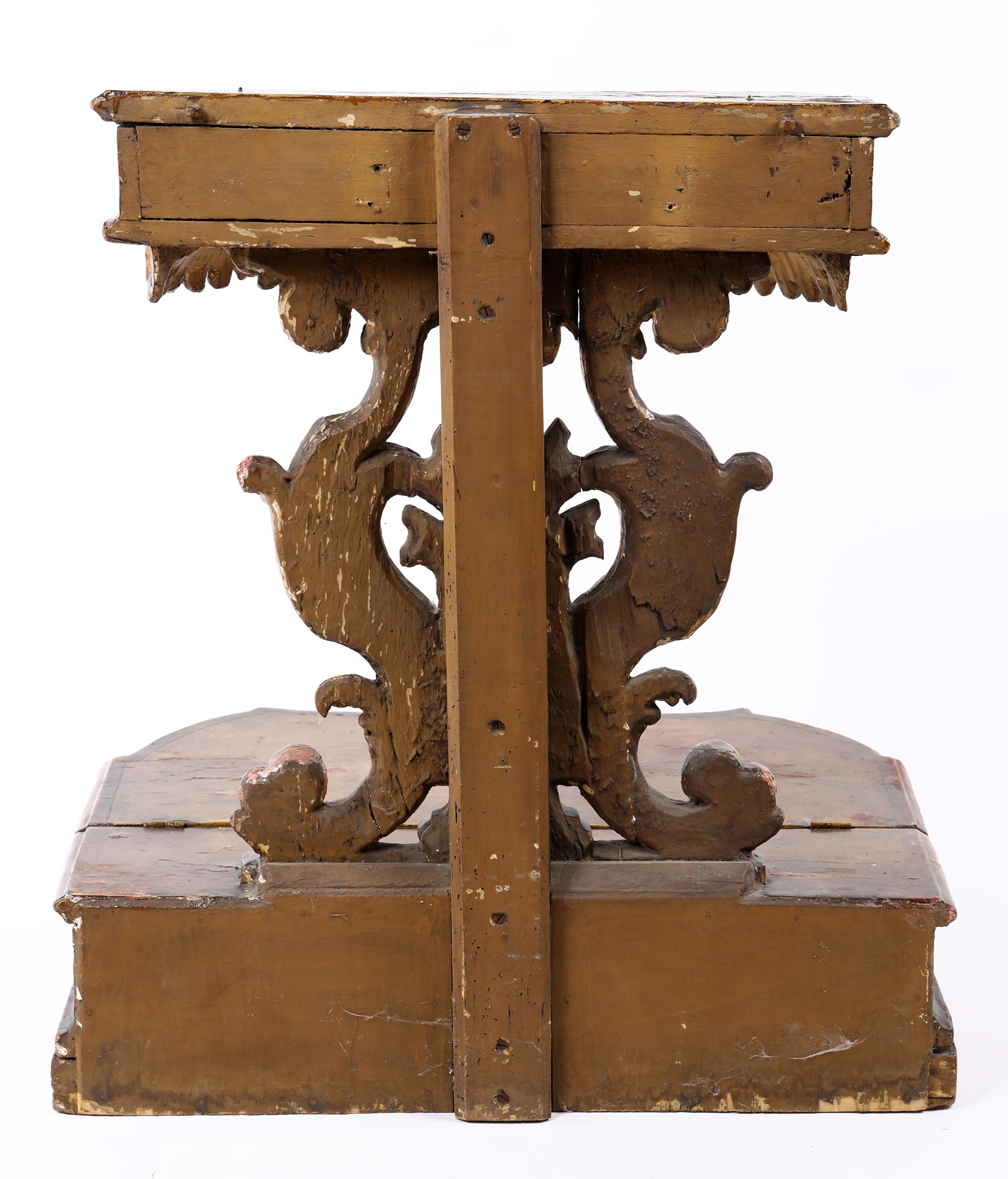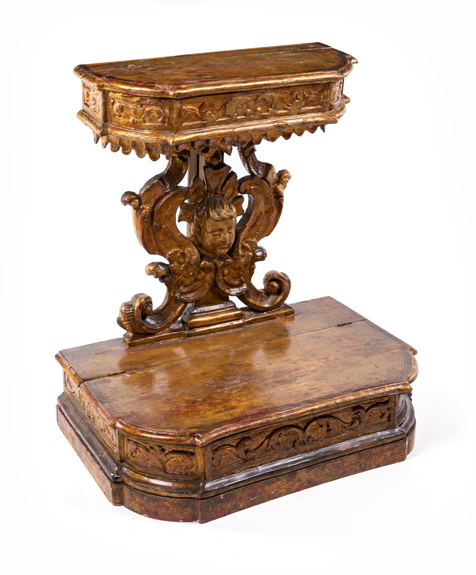 costruito con elementi antichi; sostegno costituito da volute e cartigli centrati da testa di cherubino, base e parte superiore con piani apribili e fascia percorsa da rilievi vegetali intagliati
