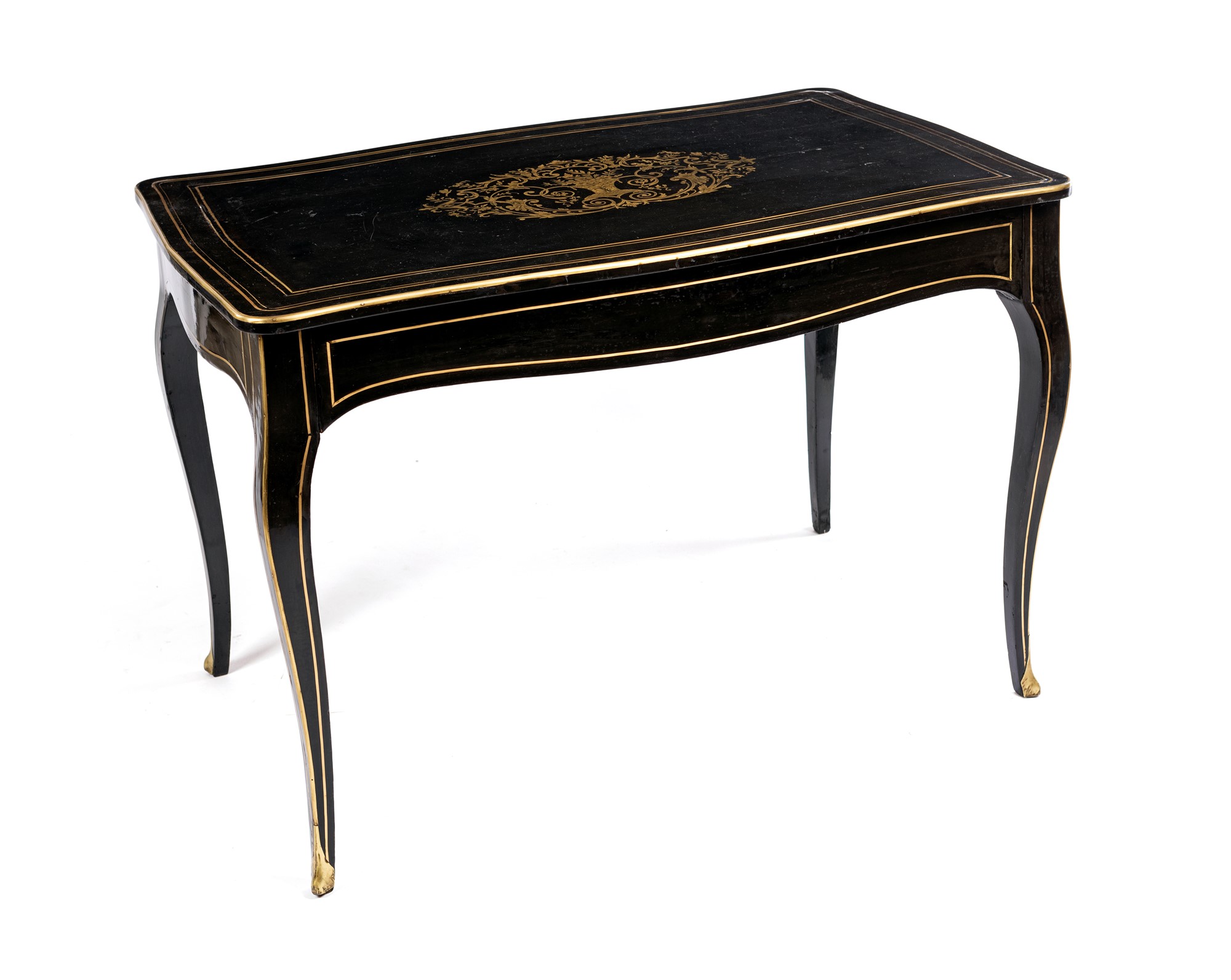 con profili e filettature in metallo dorato; piano rettangolare sagomato centrato da una cesta ricolma di fiori circondata da girali e volute realizzati ad intarsio; un cassetto compreso nella fascia, gambe mosse
