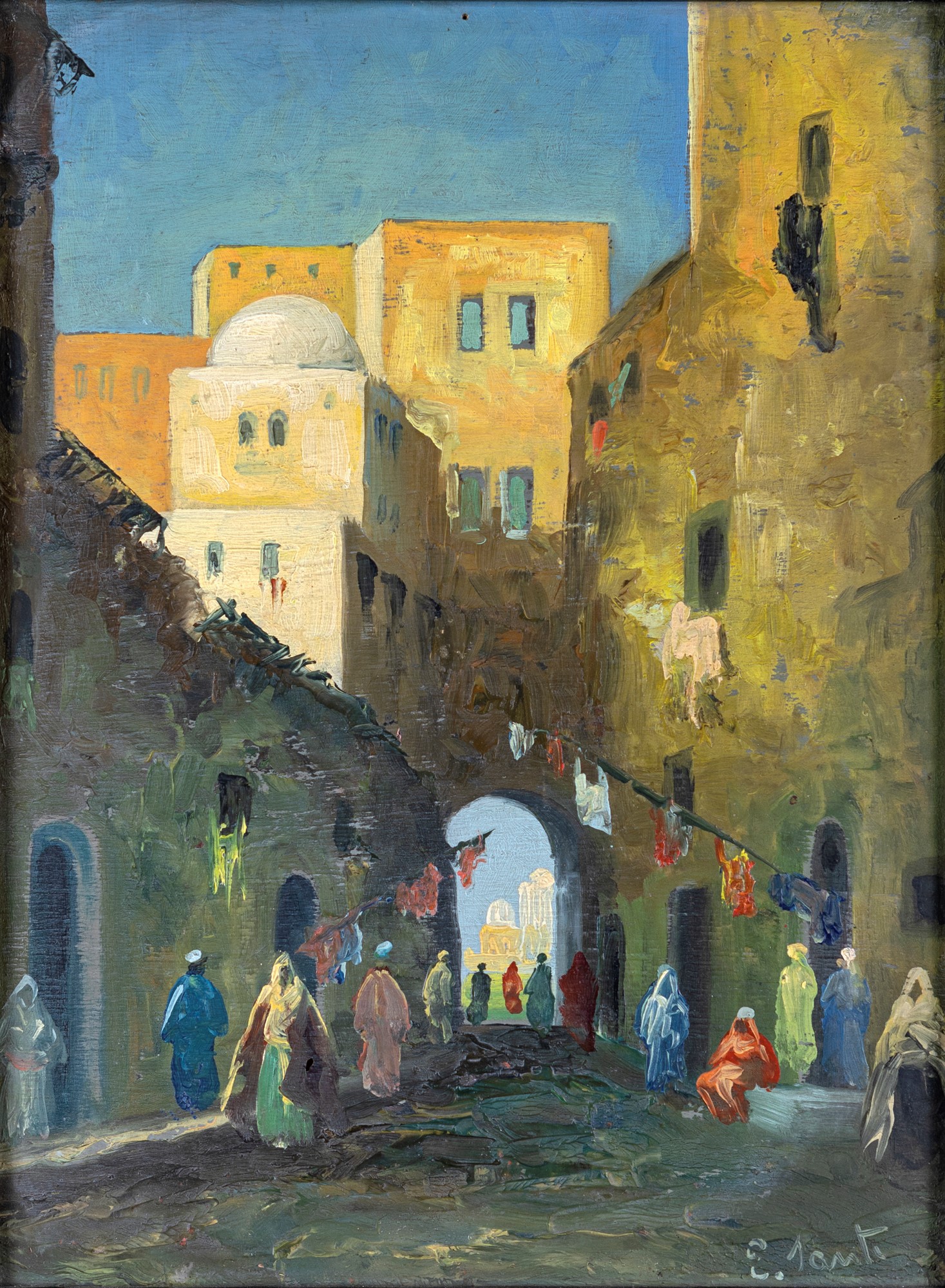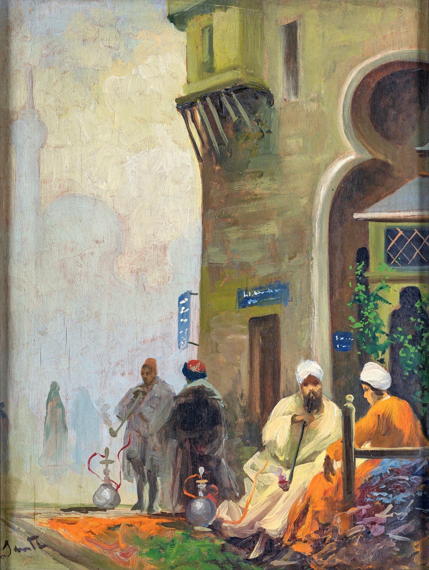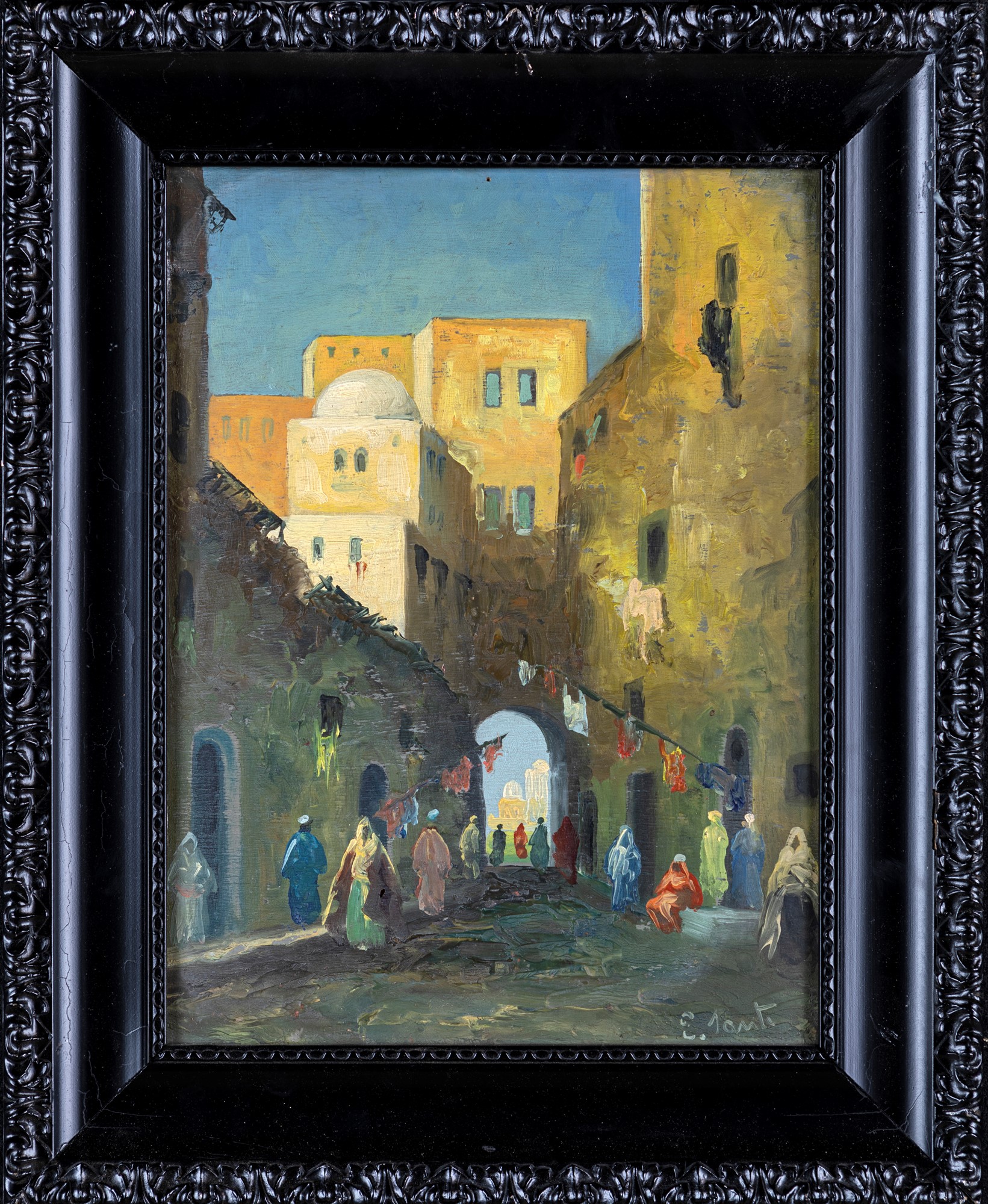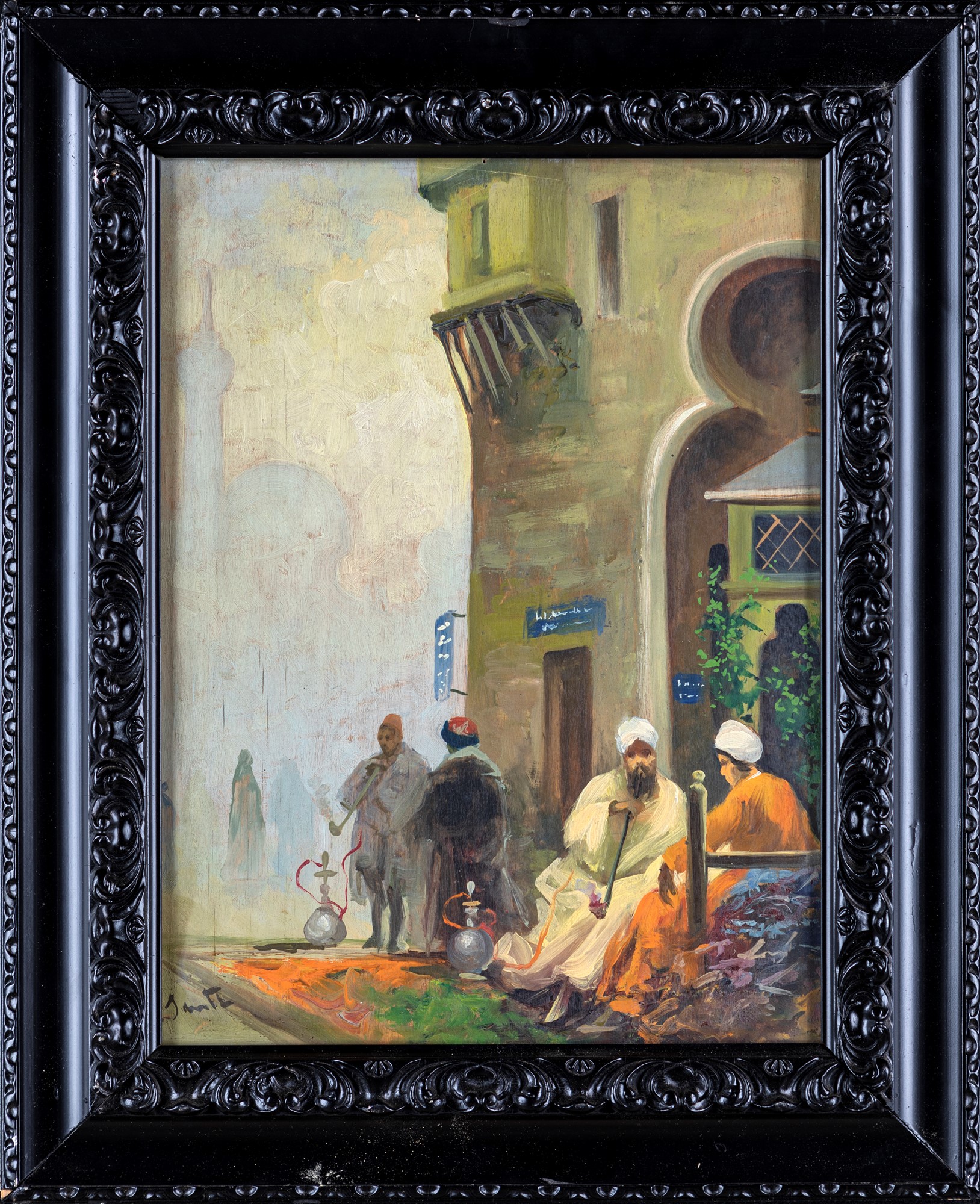 Lot 282 | a) Veduta di città medio-orientale b) Fumatori di narghilé coppia di olii su tela cm 39x30 - in cornice cm 52x42 ca.
