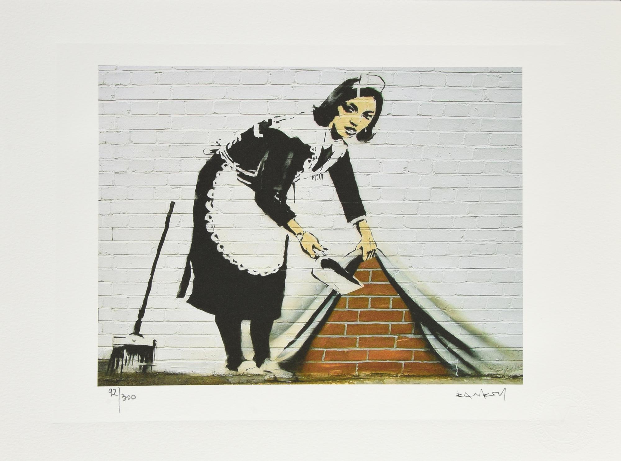 Da Banksy SWEEP IT UNDER THE CARPET eliografia, cm 38x28.5; es. 92/300...