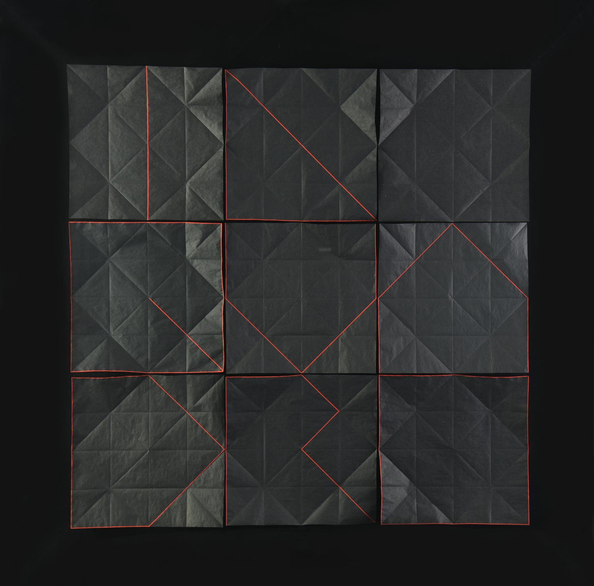 pittura, collage di carte piegate su supporto plastico applicate su tavola, cm 68x68