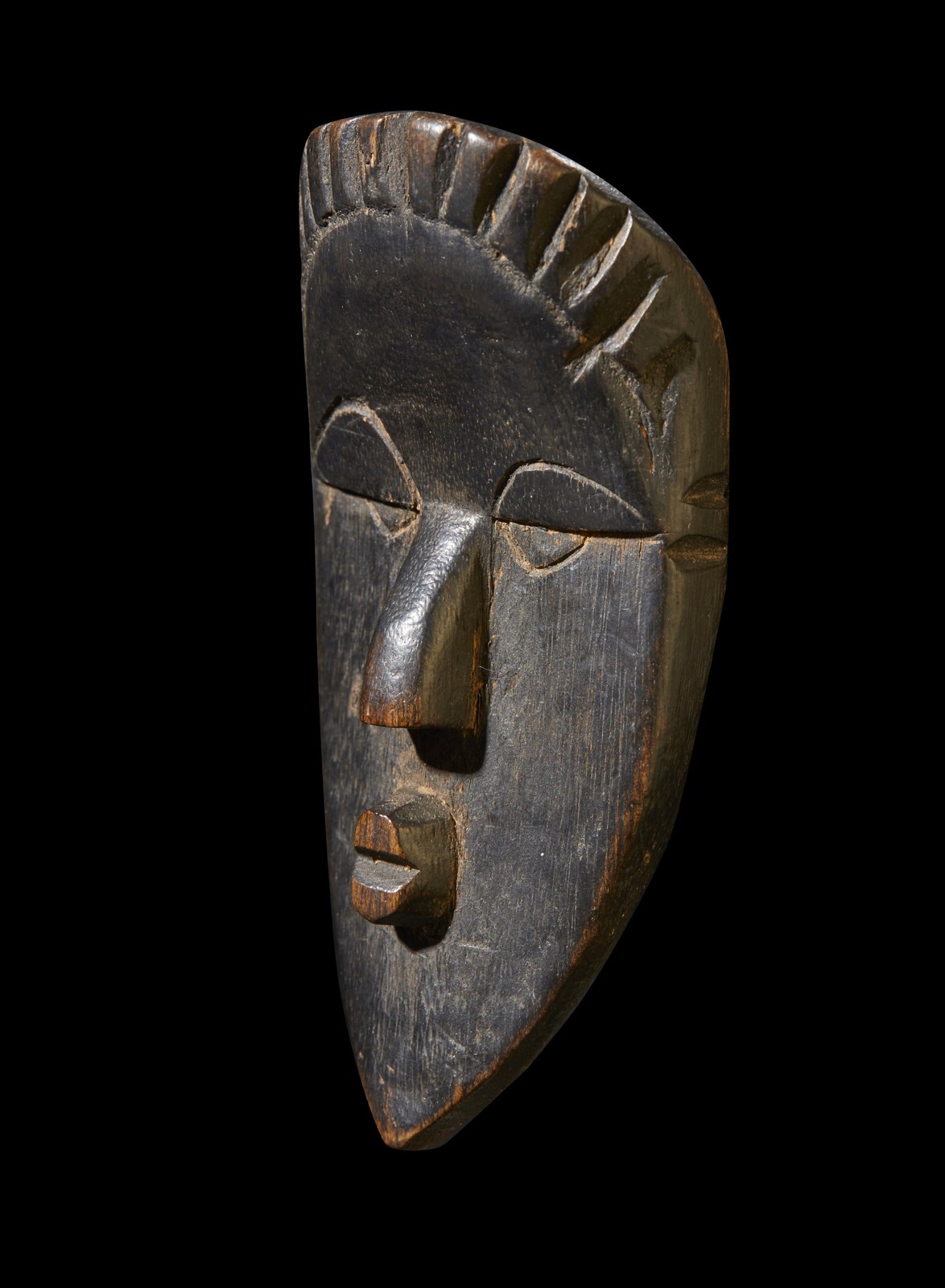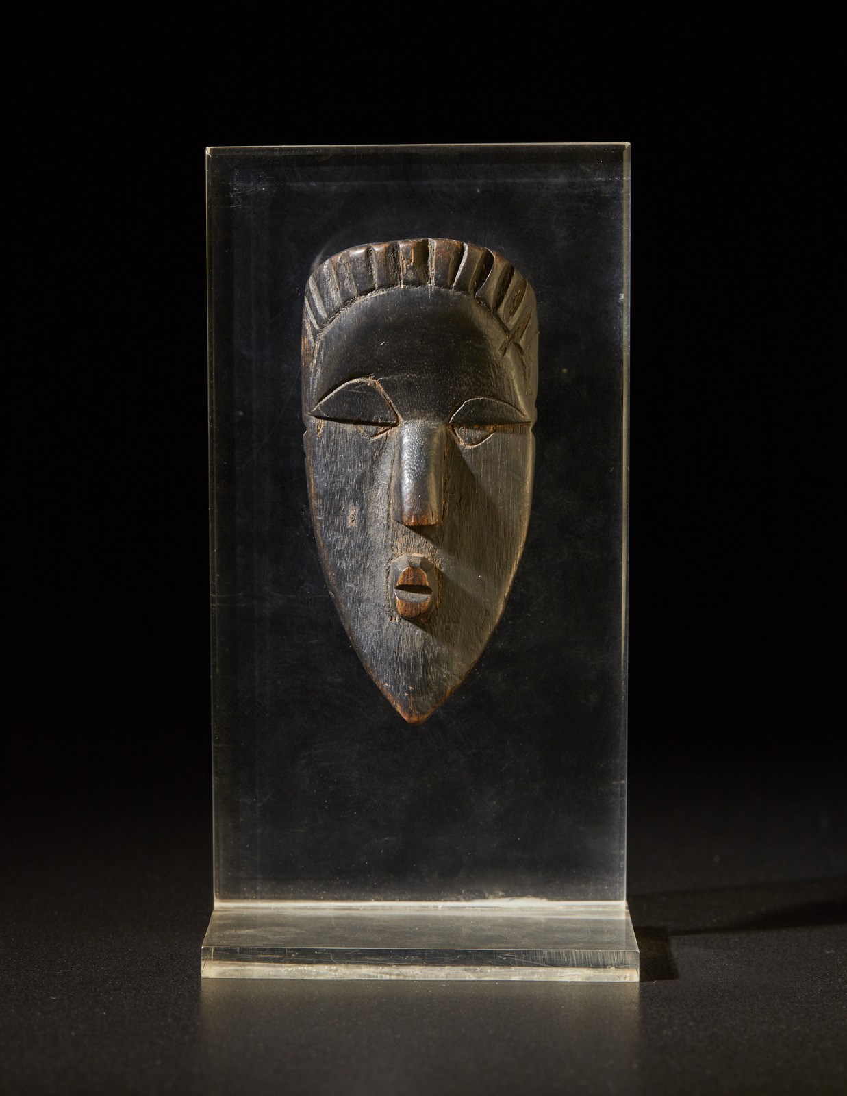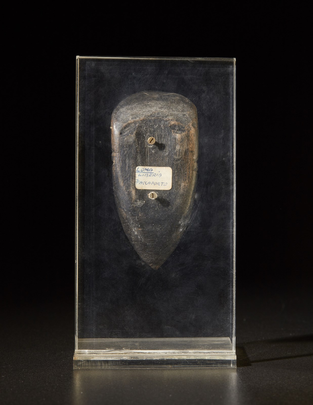 Lot 34 | Bassa - Liberia - Maschera in miniatura. Legno duro a patina scura. Segni d'uso. con base in plexiglass.
