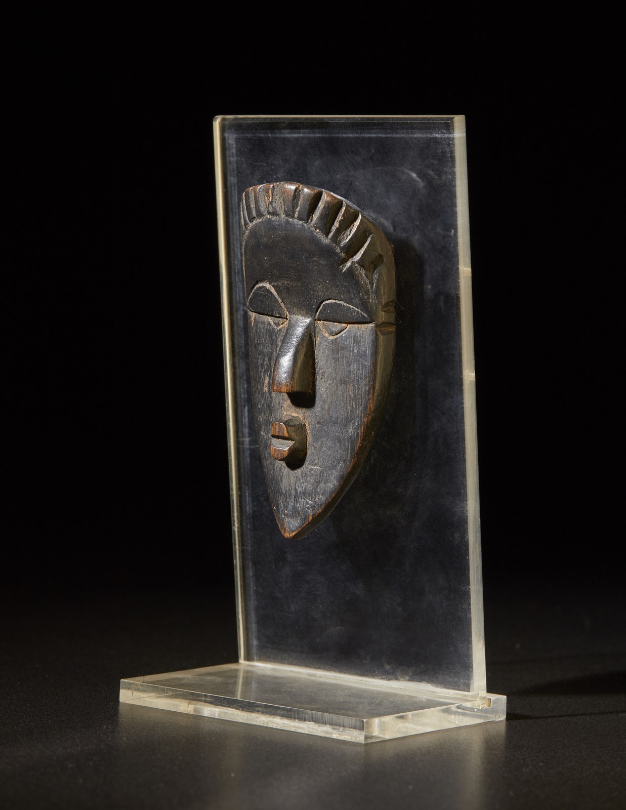 con base in plexiglass. . Cm 4,00 x 8,00 x 2,00. Piccola maschera Bassa estremamente sintetica, ma stilisticamente impeccabile.