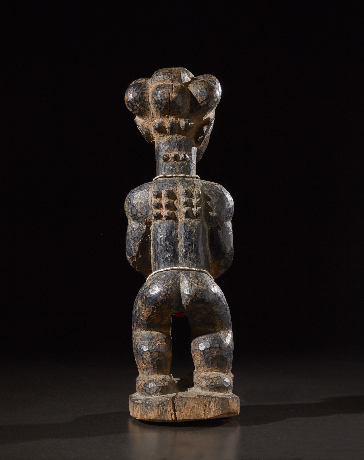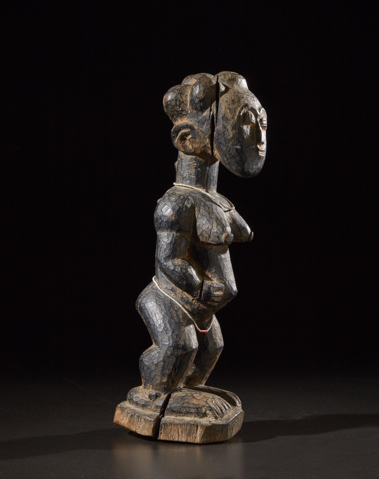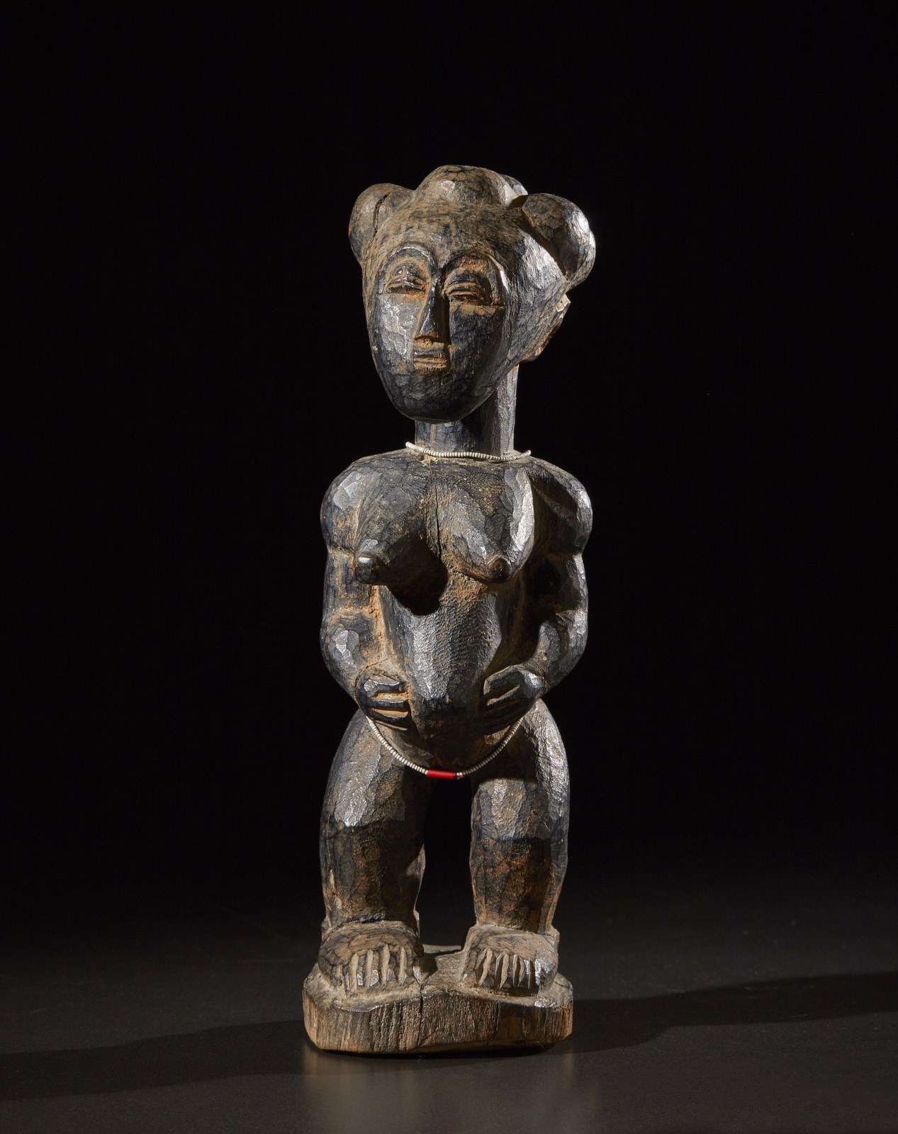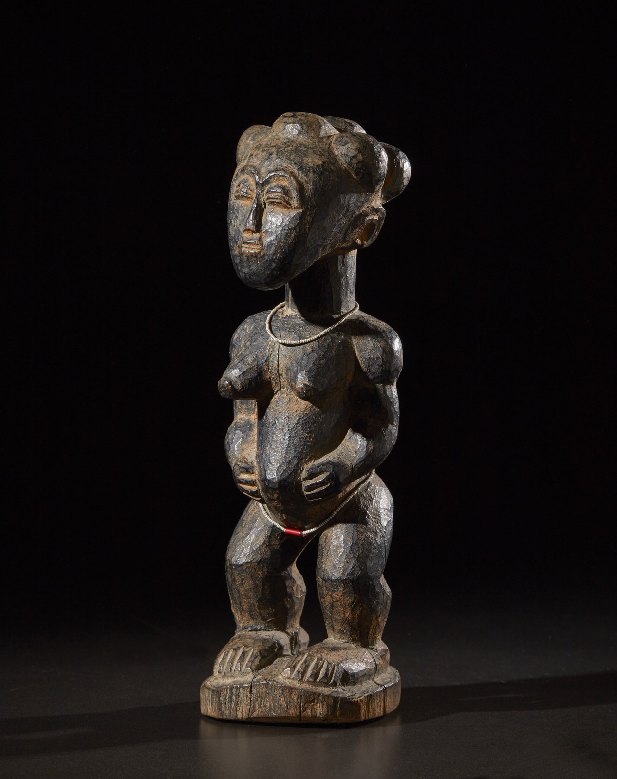 Difetti e segni d'uso. . Cm 10,00 x 30,50 x 9,50. Scultura femminile Baulè di discreta qualità di intaglio e proporzionate volumetrie, caratterizzata dallo stile modesto della acconciatura a boccoli sferici, dalle mani composte in atteggiamento materno protettivo sul ventre, e da un corpo con volumi definiti e massicci, dettagli particolareggiati, che richiamano alla mente stilemi espressivi di altre etnie come gli Agni o Attie. Queste influenze ci inducono a collocare la provenzienza geografica di questa scultura all'interno della regione dei Laghi della Costa d'Avorio, che sebbene non particolarmente estesa, contiene una miriade di popolazioni e gruppi etnici caratterizzati da contaminazioni culturali ed influenze stilistiche.