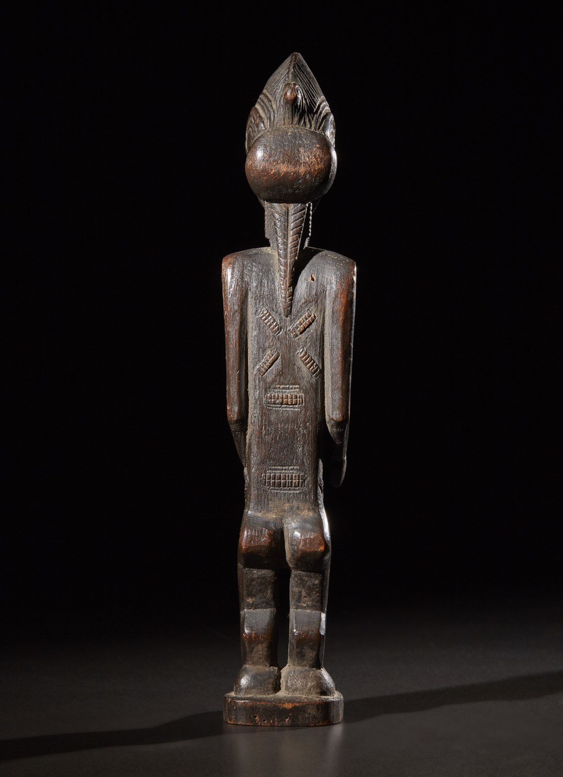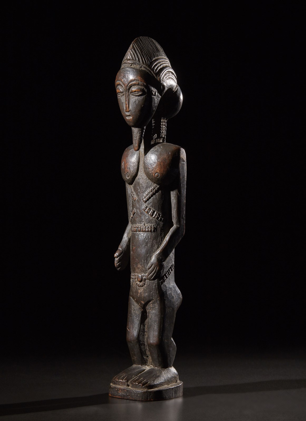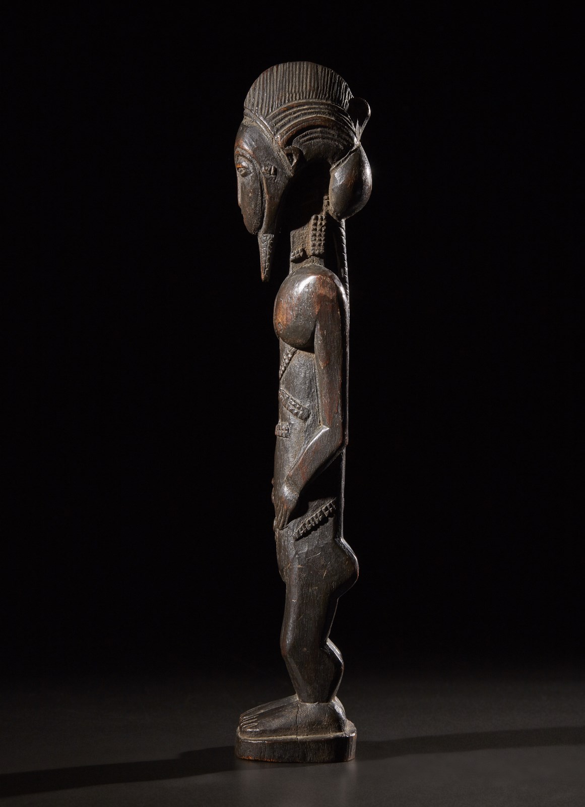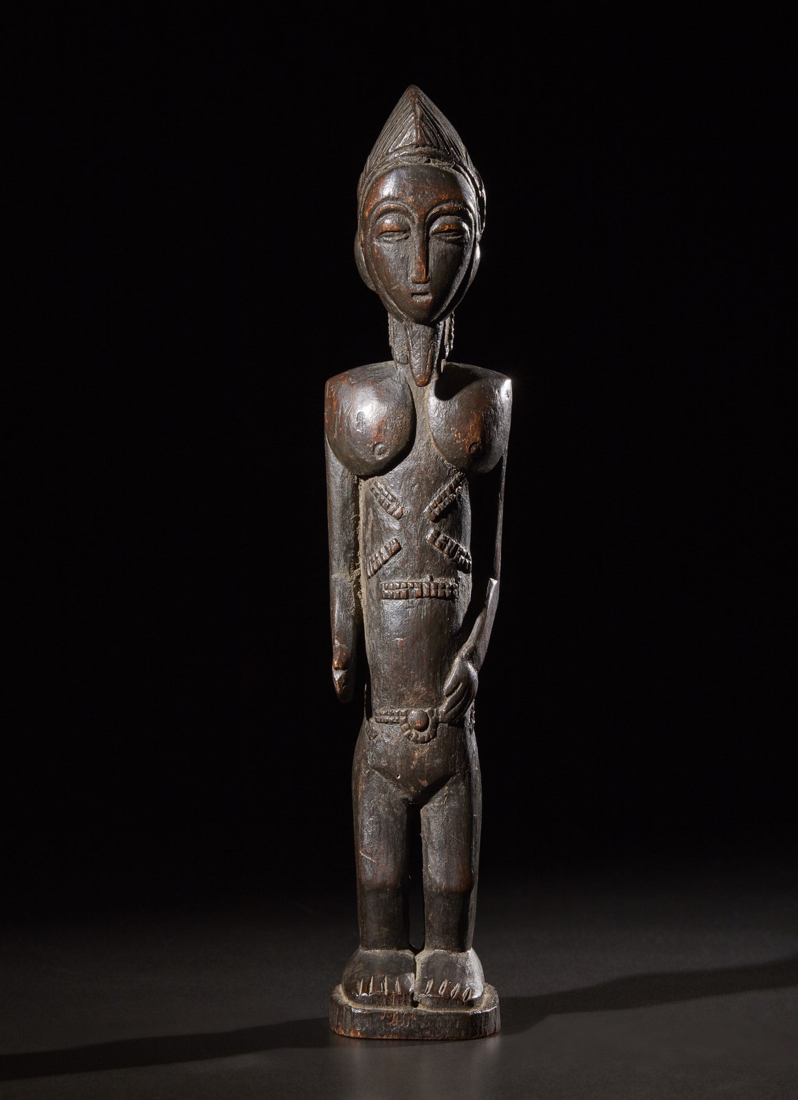 Le sculture di antenati come questa vnivano preziosamnete custodite dai Baulè nelle case ed erano regolarmente oggetto di libazioni di olio di palma o burro vegetale che conferiva al legno, nel tempo, una caratteristica patina lucida.