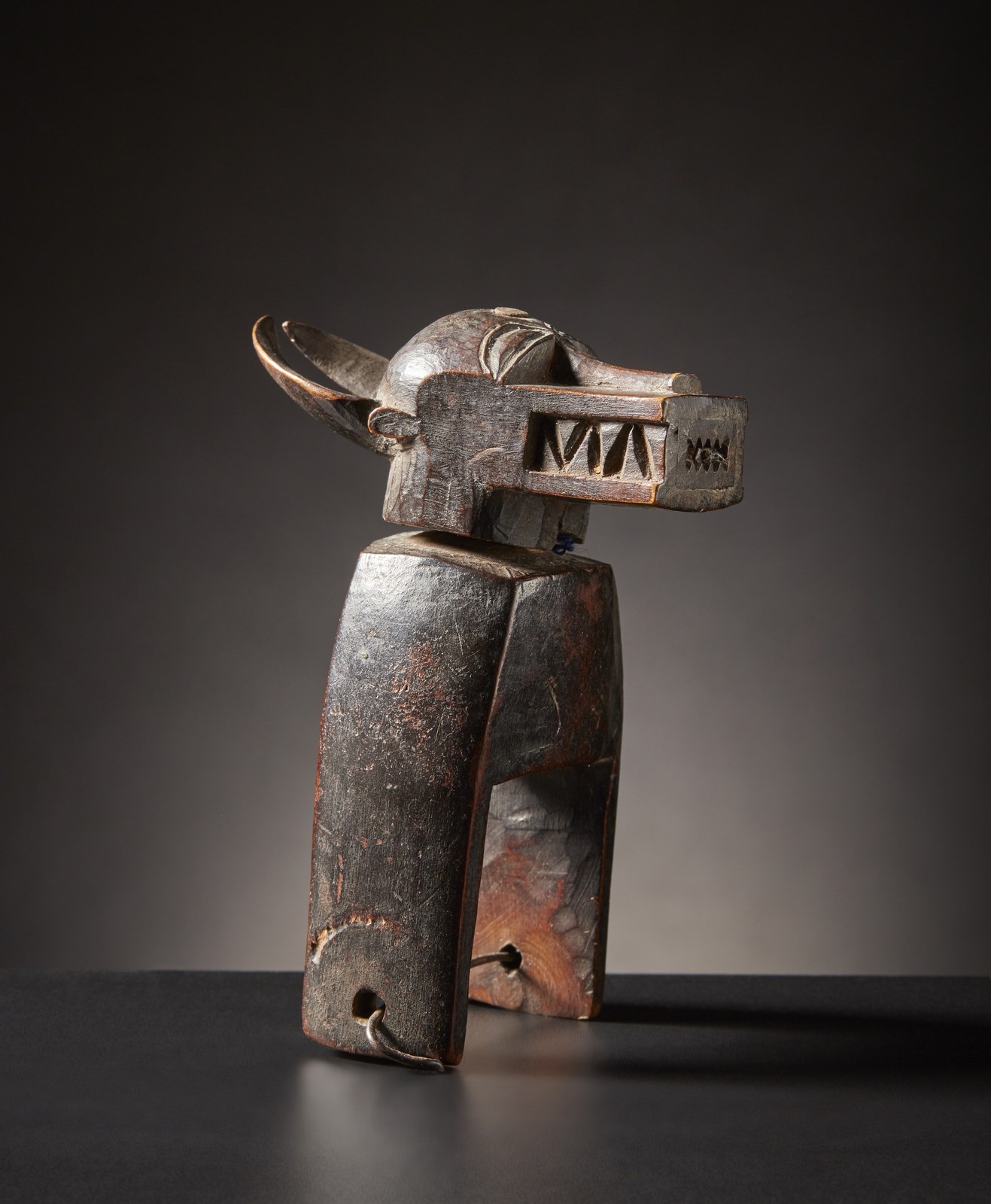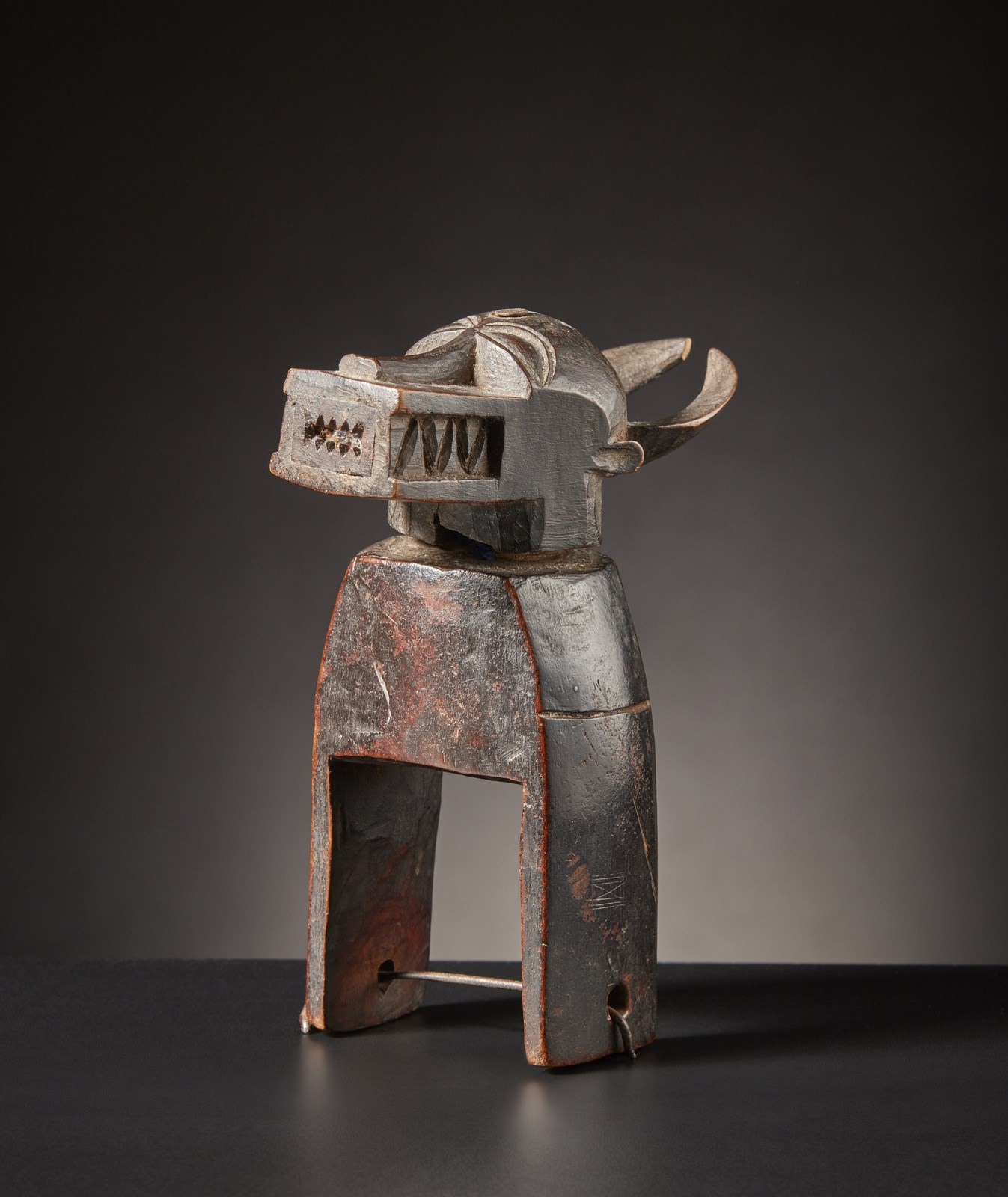 La testa dell'animale tipico della scultura Senufo si presenta rotante e fissato con un chiodo. Difficile dire se sia nato cosi o"sposato" successivamente.