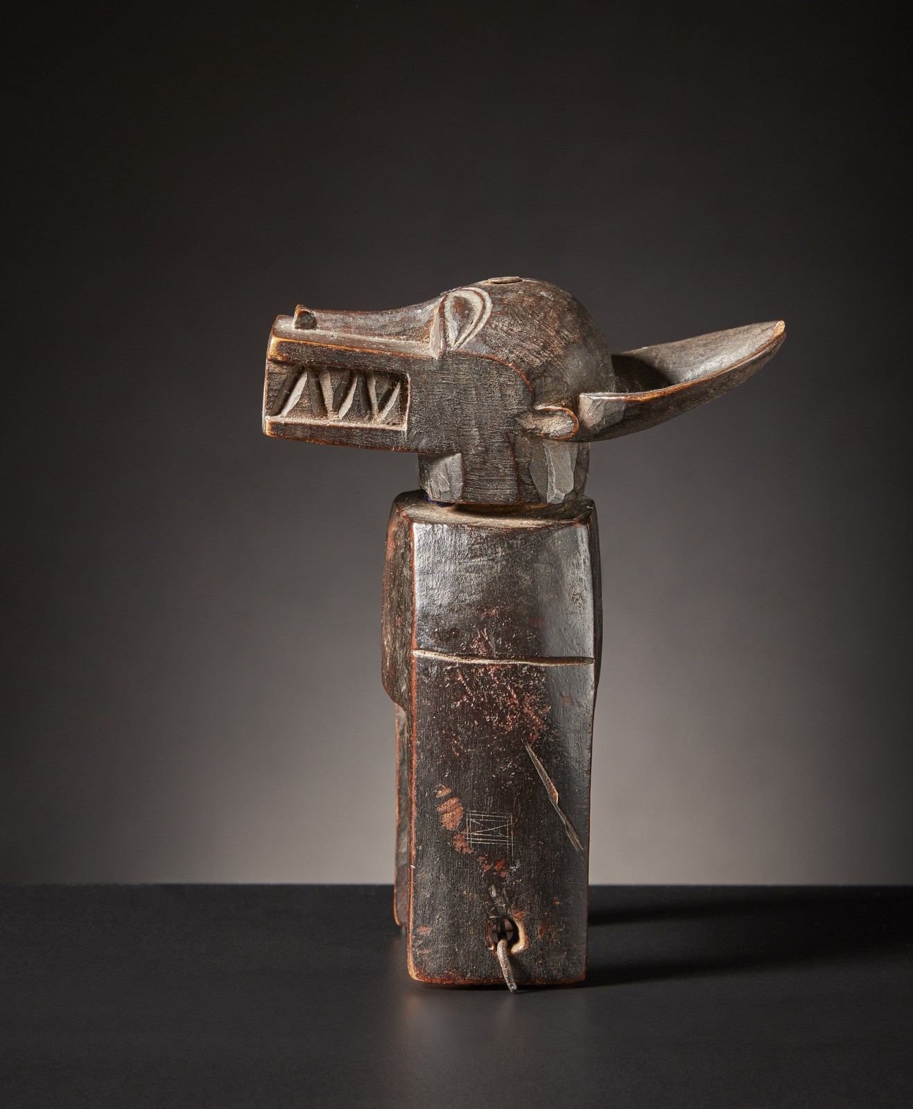 Segni d'uso. . Cm 10,50 x 14,50 x 6,00. Bella puleggia da telaio ornata da figura zoomorfa wanyugo o maschera sputafuoco.