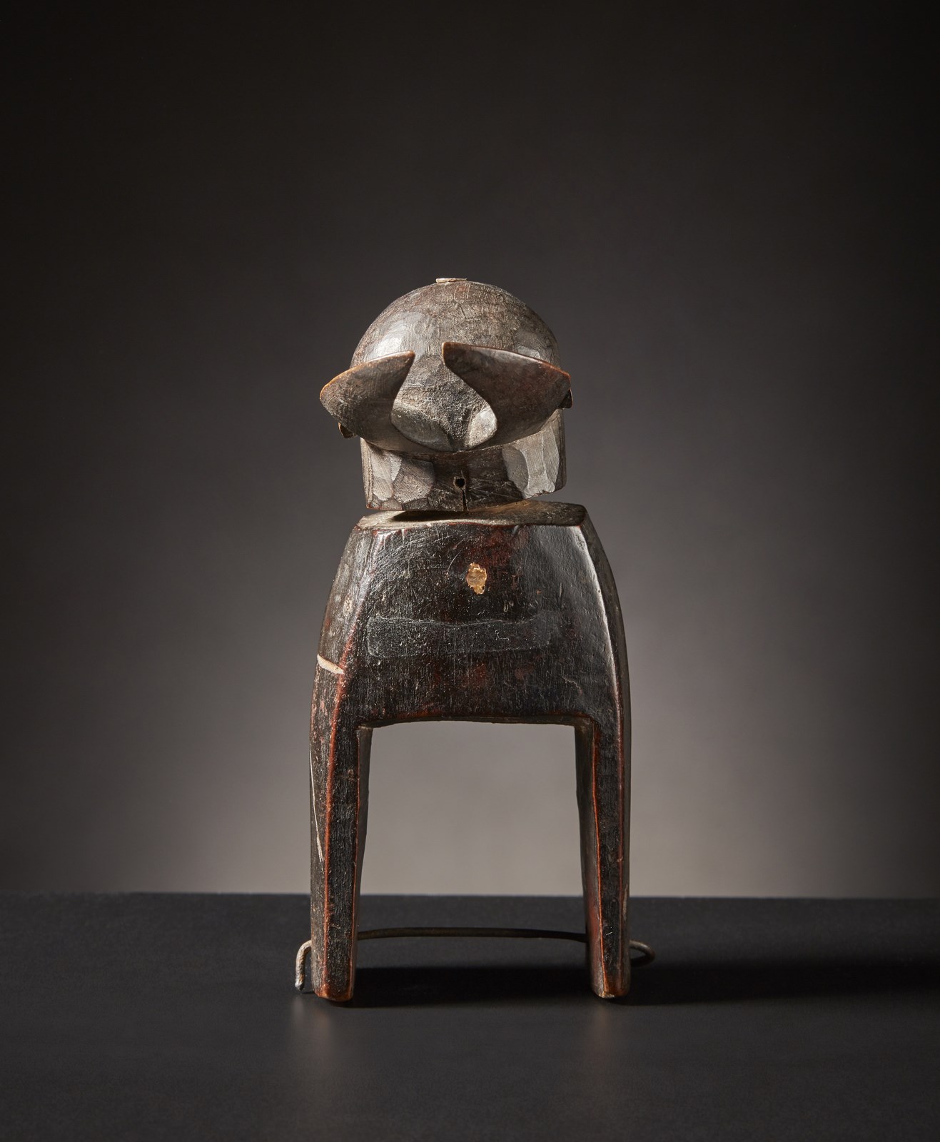 Senufo - Costa d'Avorio, Mali - Puleggia da telaio. Legno duro a patina scura, metallo. Segni d'uso.