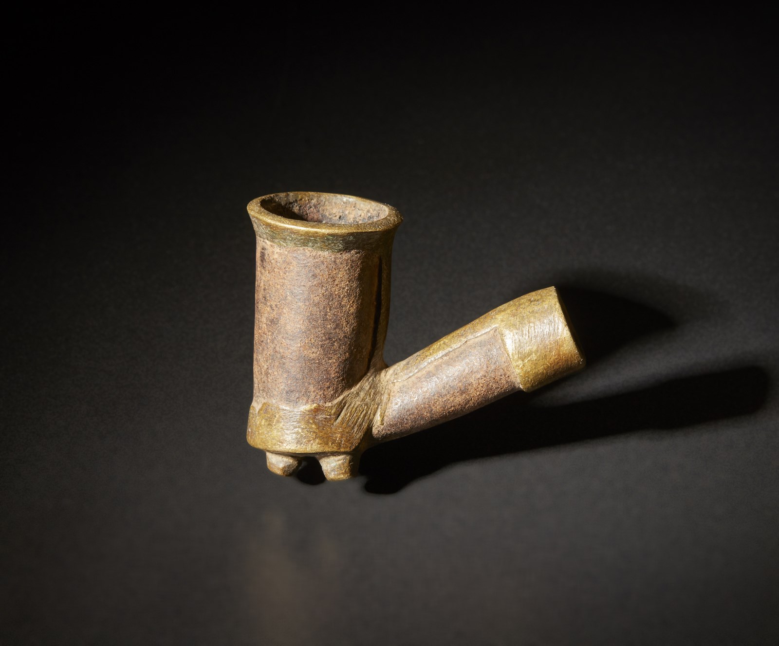 Segni d'uso. . Cm 13,00 x 19,00 x 6,00. Difficile stabilire la zona di provenienza di questo bel fornello da pipa realizzato in ferro ingabbiato da lega di ottone. I tre piedini alla base danno l'idea della cura prestata alla realizzazione di quest'oggetto, che appoggiato avrebbe tenuto lontano il calore della brace dalla superfice di contatto.