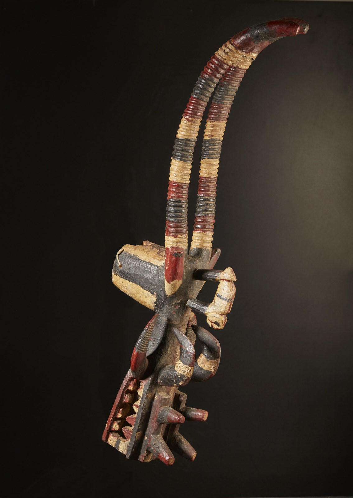 Difetti, mancanze, un restauro e segni d'uso. . Cm 27,00 x 95,00 x 23,00. Le maschere Kponyugo o Wanyugo, comunemente conosciute anche come Firespitter, erano utilizzate dalla società iniziatica segreta maschile Poro durante i funerali di capi e notabili per accompagnare le anime dei defunti nell'oltretomba ed allontanare gli spiriti maligni. Dato che si credeva fosse investita da potenza sovrannaturale e distruttrice, veniva utilizzata dai membri della società anche per azioni di contrasto alla stregoneria.