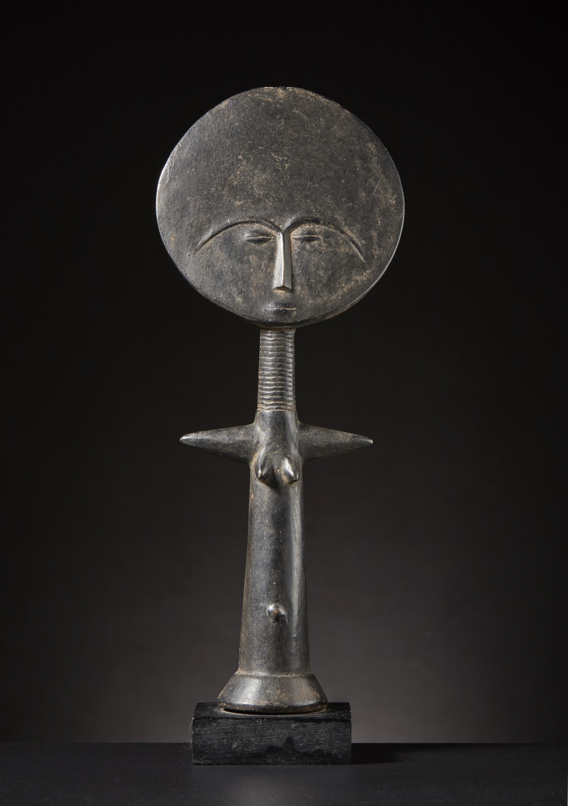 Scultura rappresentativa di tutta l'arte africana per sintesi, raffinatezza e bellezza, le Akua'ba hanno spesso il corpo stilizzato con braccia, seni ed ombelico appena accennati, rotoli di grasso intorno al collo a rappresentare ricchezza e prosperità ed un viso a disco, rotondo e piatto quasi lunare, su cui con pochi sapienti tratti sono scolpite sopracciglia, occhi, naso e bocca.