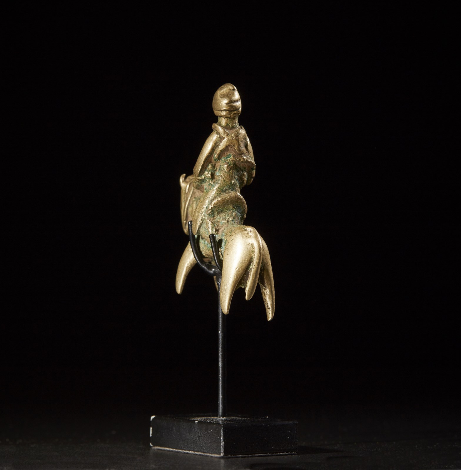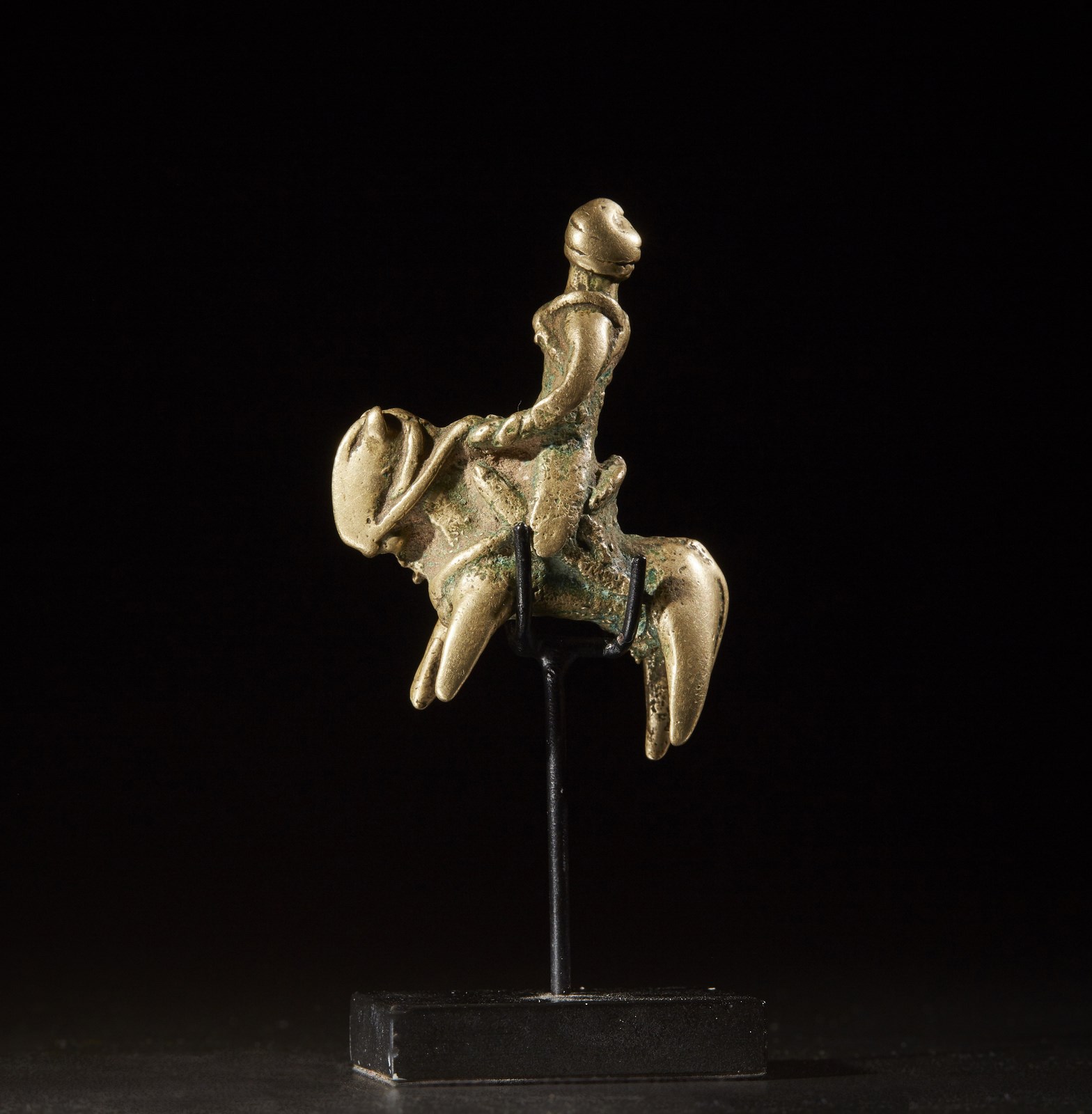 . . Cm 4,50 x 5,70 x 1,30. Piccola scultura in lega di bronzo realizzata in fusione a cera persa a forma di figura equestre con cavallo e cavaliere, utilizzata come talismano terapeutico dai Kotoko contro la follia e la possessione.
