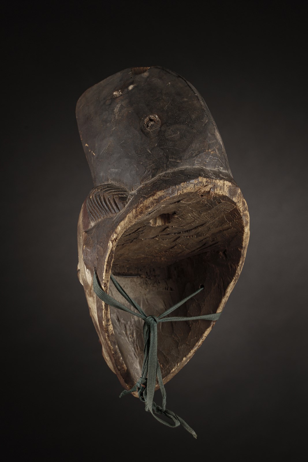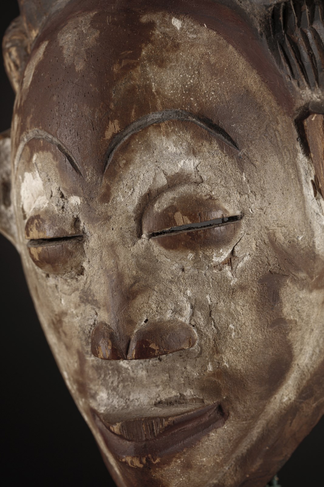 Di bella fattura e raffinata levigatura, splendida per la silhouette del profilo, questa vecchia maschera ha purtroppo subito molto dal tempo e ne porta traccia con le sue mancanze, al labbro ed orecchio. Sotto l'abbondante caolino ancora presente è visibile una densa coloritura rosso-brunastra, forse retaggio dell'utilizzo di questa maschera anche per funzioni di ordine pubblico.