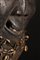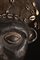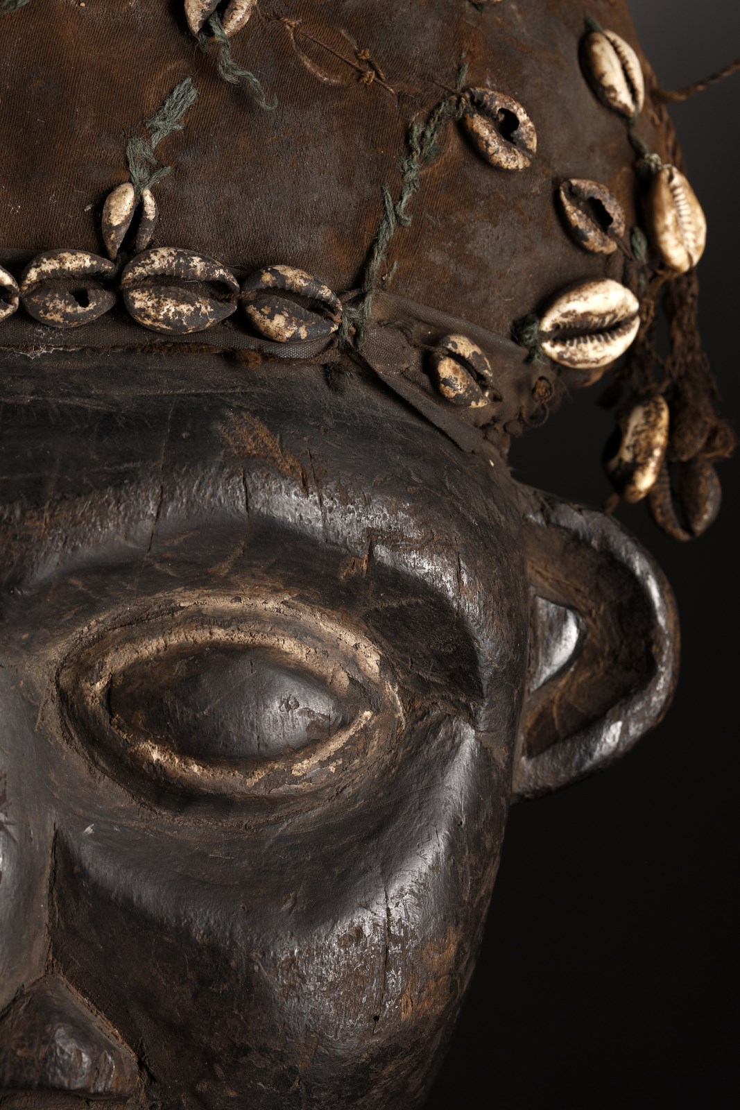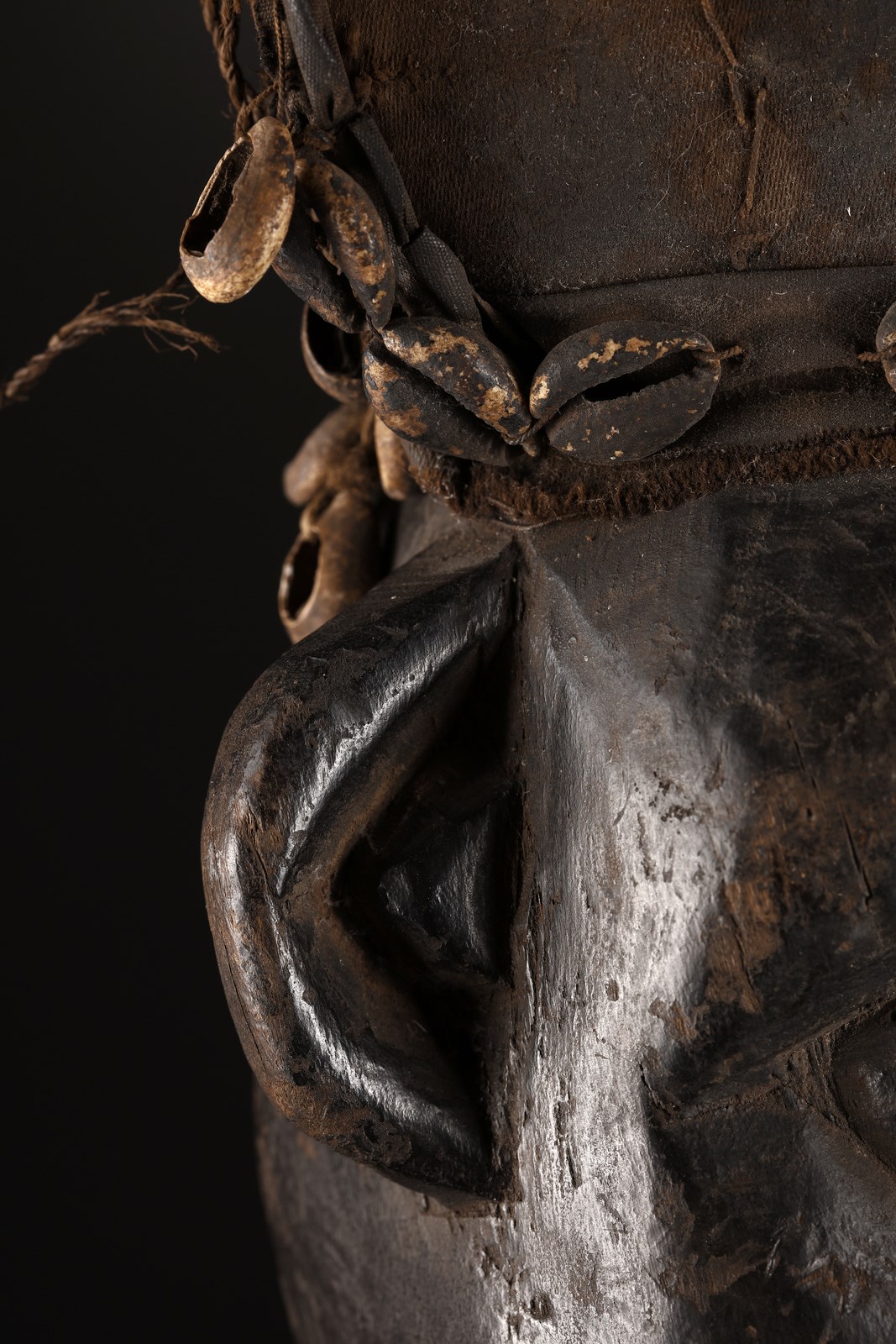 Legno duro a patina scura, tessuto, conchiglie e pigmenti.