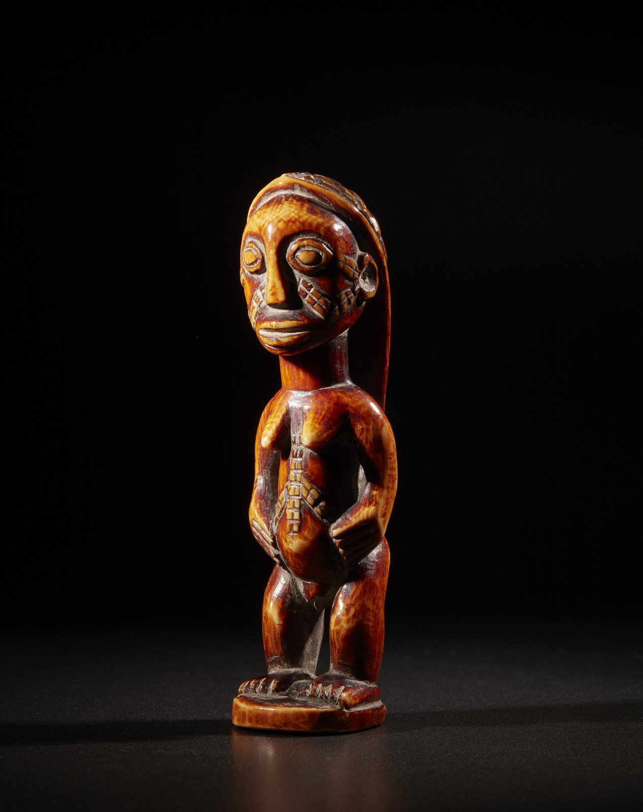 Segni d'uso. . Cm 5,00 x 14,00 x 4,00. Bella scultura di antenata in avorio, caratterizzata dalla tipica acconciatura lunga dei capelli, dagli occhi prominenti e dalle vistose scarificazioni sul volto e sull'addome.