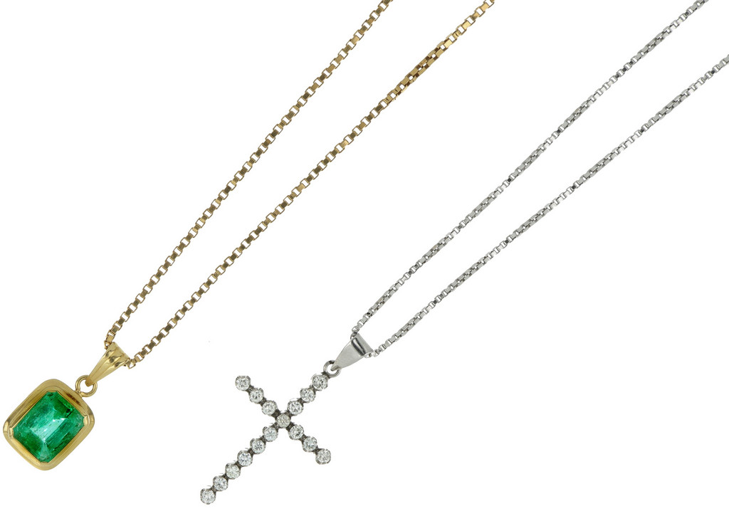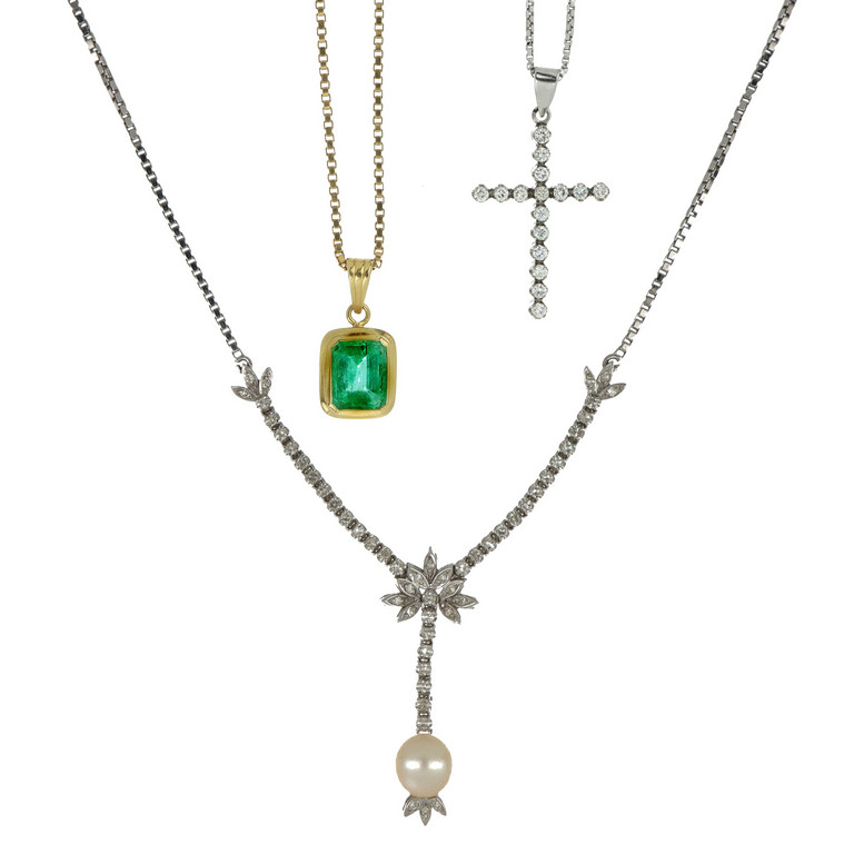 Lotto composto da 3 collane in oro giallo e pendente con smeraldo una in oro bianco le altre una con croce di diamanti taglio brillante per stimati carati 0 60 ca. l'altra con pendente di diamanti e perla coltivata di 7 90 mm diametro stimati carati 0 70 ca.