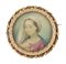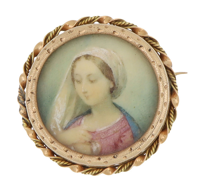 Piccola spilla in oro rosso con immaginetta e dedica al retro di forma rotonda 25 mm di diametro.