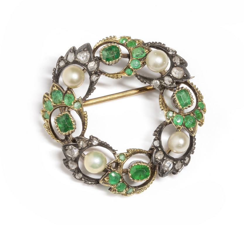 Spilla a ghirlanda in argento e oro con piccoli smeraldi e perle.