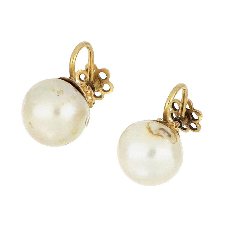 Orecchini a monachella con chiusura a vite americana in oro giallo e perle a solitario di 11 00 11 40 mm di diametro.
