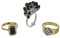 Lotto composto di 3 anelli in oro di diverso colore uno con piccolo pave' di diamanti gli altri con zaffiri e diamanti taglio brillante.