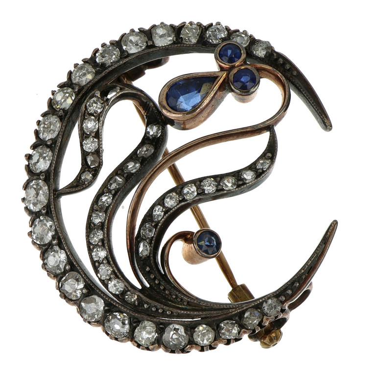 Spilla a 'Demi Lune' realizzata in oro ossidato con fine aggiorno tempestata di diamanti taglio antico per stimati carati 3 00 ca. uno mancante piccoli zaffiri.
