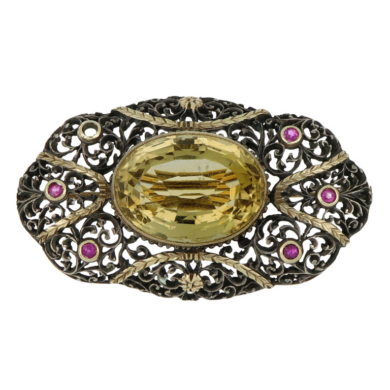 Spilla in argento e oro giallo traforata con grande pietra gialla al centro e piccoli rubini.