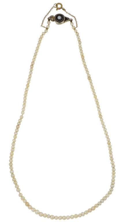 Fine collana di perle probabilmente naturali 3 mm diametro montata con chiusura in oro giallo e bianco con piccoli zaffiri e perlina centrale.