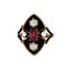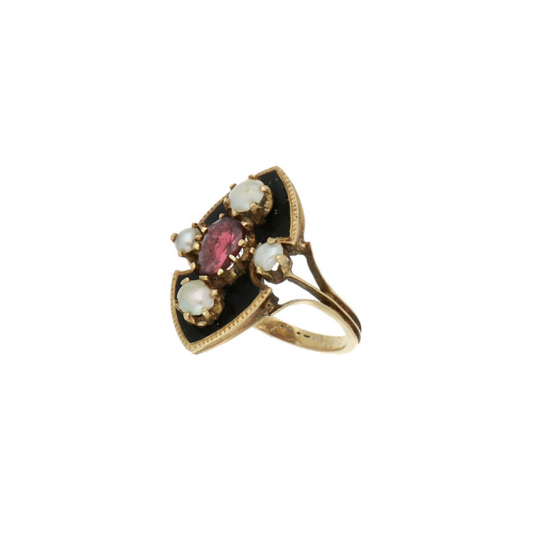 Anello in oro rosso a scudo in smalto nero perline mabè e rubino a goccia centrale.