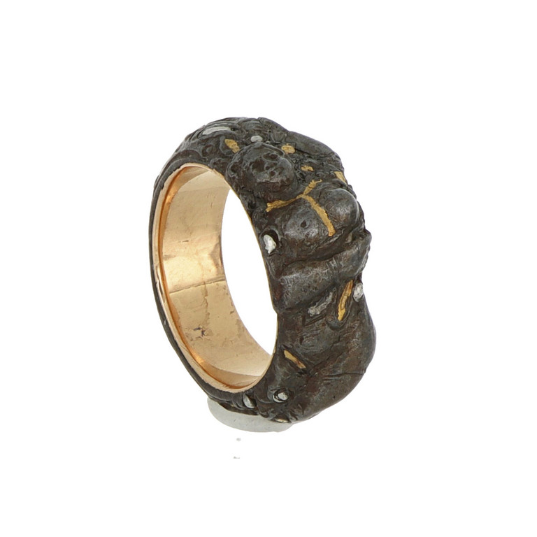 Antico anello scultura in acciaio e oro giallo raffigurante donna nuda sdraiata niellato e foderato con lamina d'oro finemente inciso.