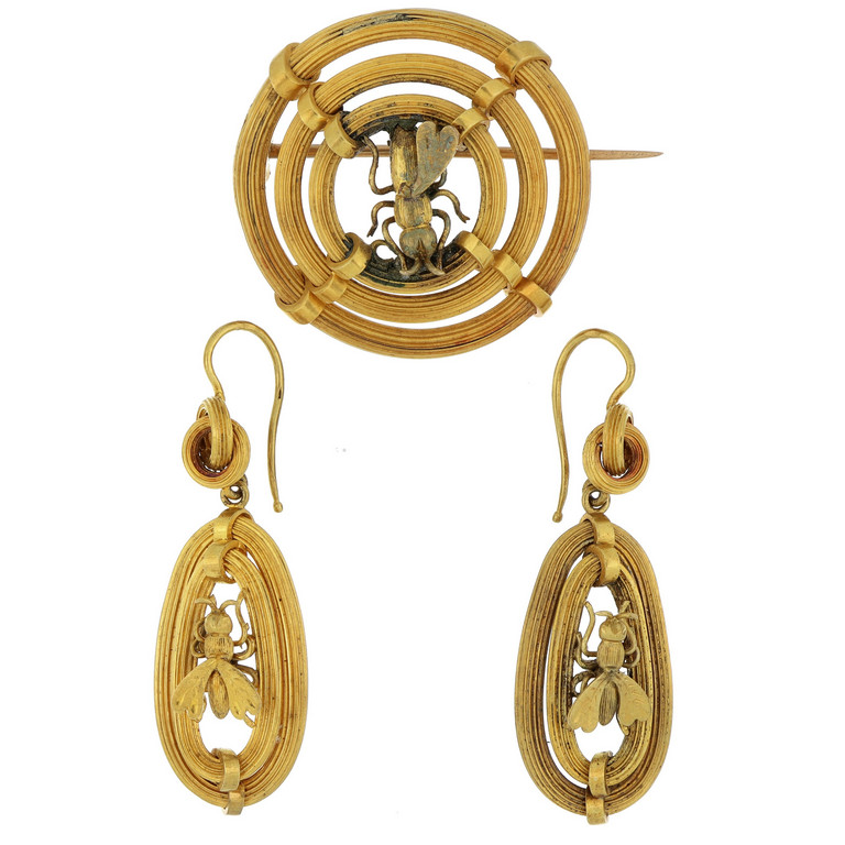 Parure composta da 3 pezzi in oro coppellato una spilla e un paio di orecchini a monachella adornati con piccole mosche spilla con difetti.