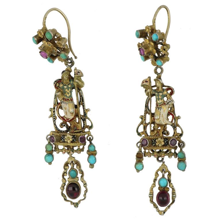 Orecchini antichi austroungarici in oro basso titolo con rotture e difetti montatura a monachella figure femminili con smalti policromi e pietre di colore.