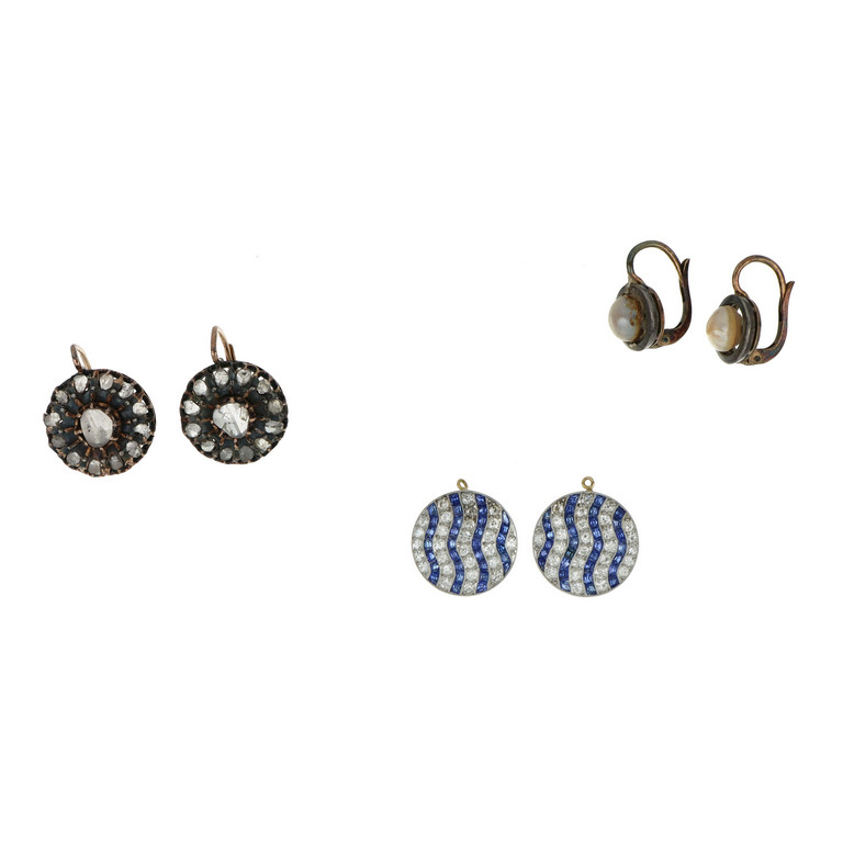 Lotto composto da 3 paia di orecchini in oro di diverso colore e titolo uno in platino con finissima lavorazione a ondine tempestate di piccoli diamanti e zaffiri mancanti della clips gli altri con diamanti taglio rosa e perle con montatura a monachella.
