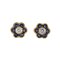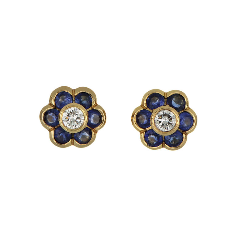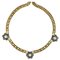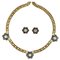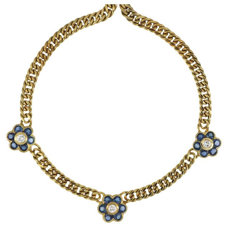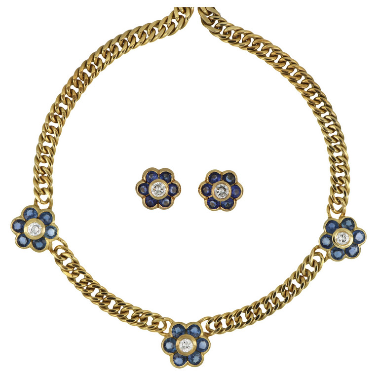 Demi' parure composta da girocollo in oro giallo maglia grumette doppia intercalata da 3 fiorellini di zaffiri taglio rotondo e al centro diamanti taglio brillante e orecchini coordinati montatura con perno a vite americana.