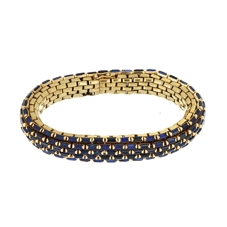 Bracciale snodato in oro giallo maglia tubolare sormontato da 5 file di baguette di corindoni blu sintetici lunghezza 19 cm.