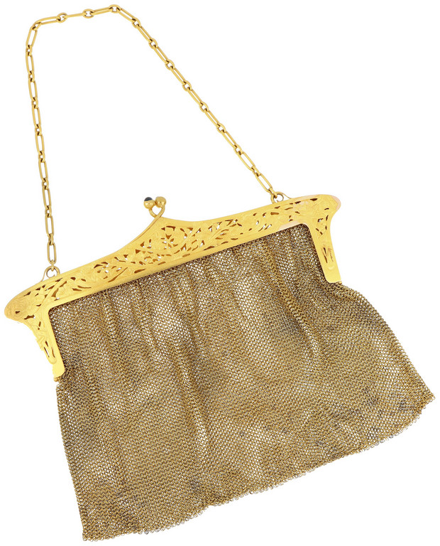 Borsetta da sera in oro giallo coppellato con chiusura a scatto e piccoli zaffiri cabochon decorata a motivi floreali traforati e incisi sulle guanciole catenella in oro.