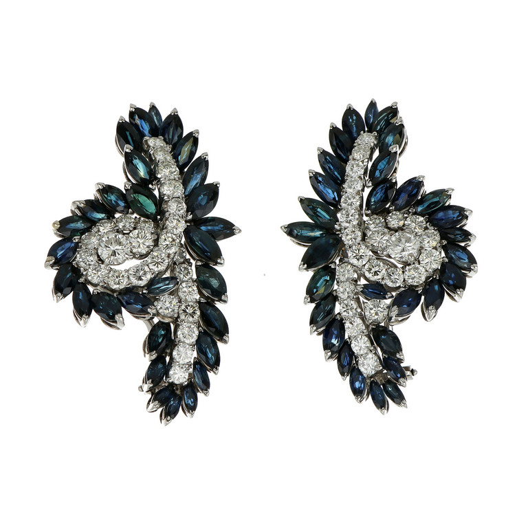 Orecchini in oro bianco con zaffiri taglio navette per carati stimati 10 ca. e diamanti taglio brillante per stimati carati 4 50 ca. realizzati a motivo di nodo chiusura con perno e clips hanno dimensione di 4 5 per 3 cm.