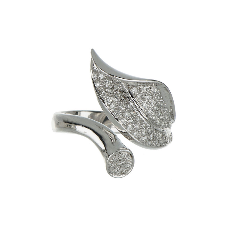 Anello in oro bianco a forma di foglia con incastonati diamanti taglio brillante a pave'.