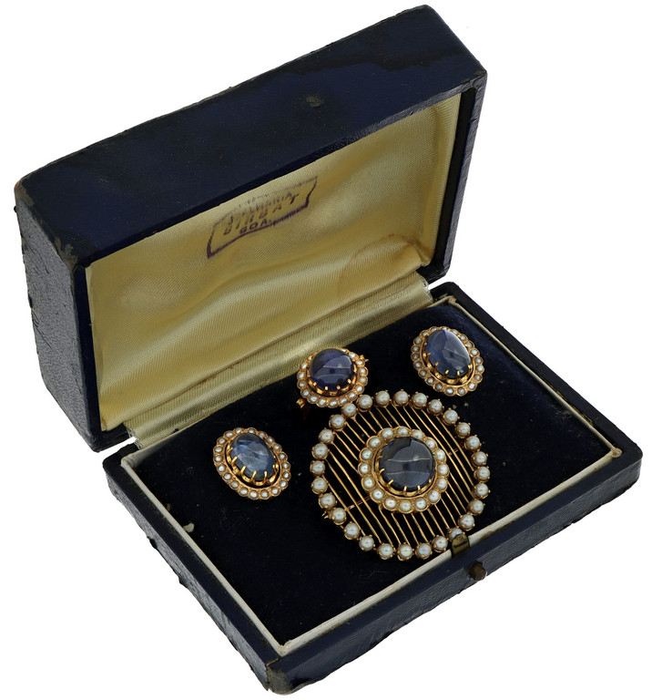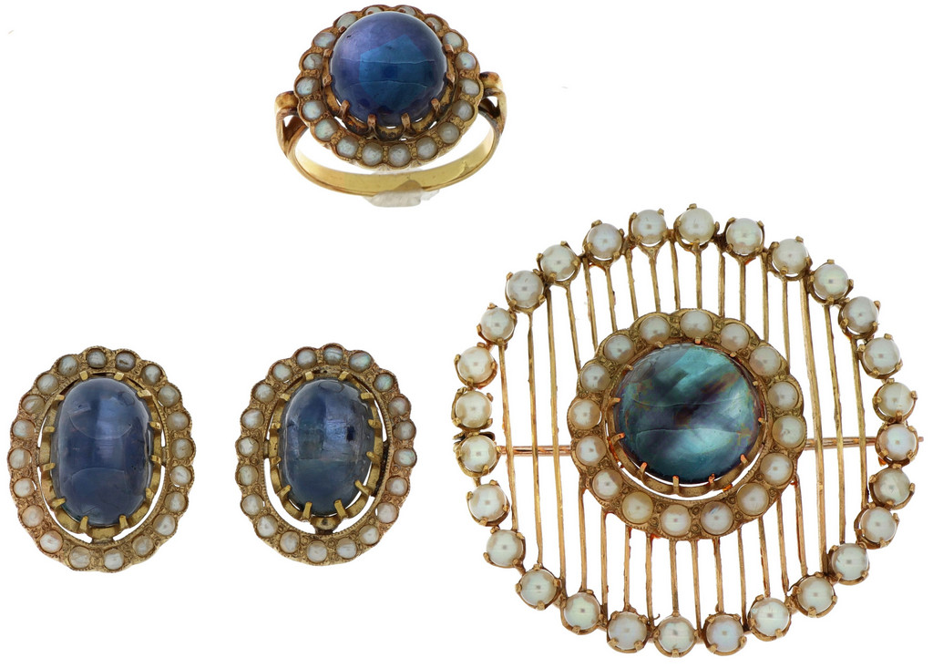 Parure composta di 4 pezzi anello spilla e orecchini tutti sormontati da uno zaffiro cabochon (quello dell' anello mostra asterismo) e contornati da piccole perle.